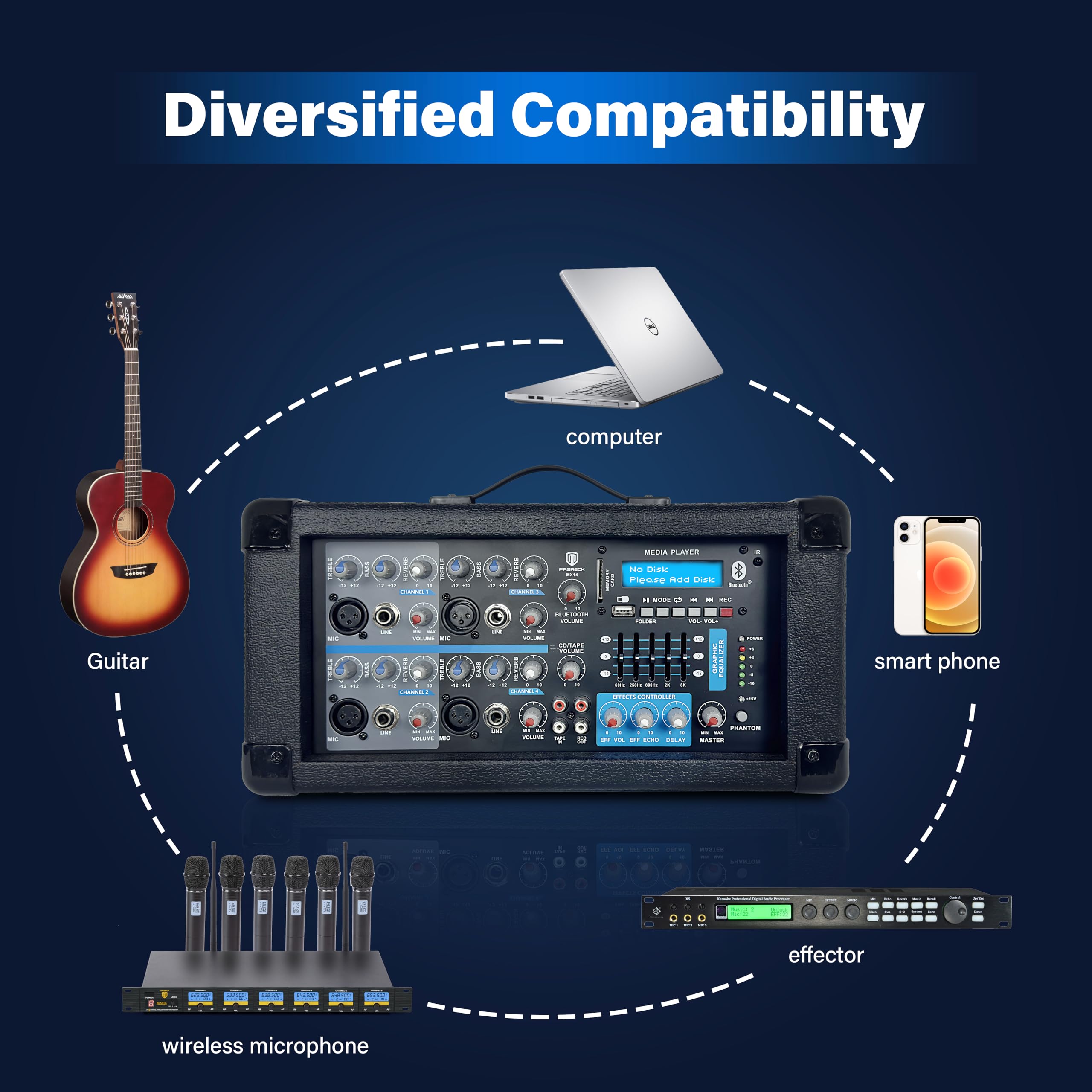 4-Channel Powered Mixer: Proreck 4-channel mixer allows you to connect multiple audio sources, including microphones, instruments, and Bluetooth devices. With reverb effects and 15V phantom power, it's perfect for professional sound mixing and live performances.