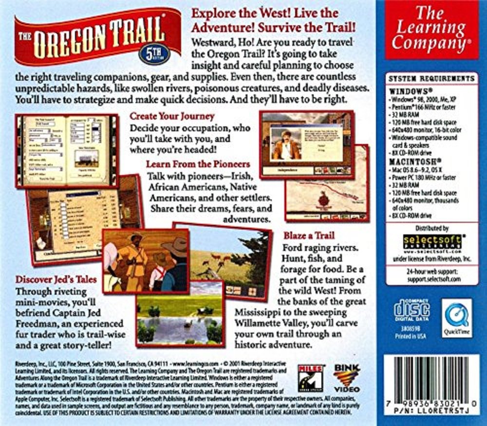 Product description Explore the West! Live the Adventure! Survive the Trail! Westward, Ho! Are you ready to travel the Oregon Trail? It‘s going to take insight and careful planning to choose the right traveling companions, gear, and supplies. Even then, there are countless unpredictable hazards, like swollen rivers, poisonous creatures, and deadly diseases. You‘ll have to strategize and make quick decisions. And they‘ll have to be right. Create Your Journey Decide your occupation, who you‘ll take with you, and where you‘re headed! Learn From the Pioneers Talk with pioneers - Irish, African Americans, Native Americans, and other settlers. Share their dreams, fears, and adventures. Blaze a Trail Ford raging rivers. Hunt, fish, and forage for food. Be a part of the taming of the wild West. From the banks of the great Mississippi to the sweeping Williamette Valley, you‘ll carve your own trail through an historic adventure. Discover Jed’s Tales Through riveting mini-movies, you‘ll befriend Captain Jed Freedman, an experienced fur trader who is trail-wise and a great story-teller! Windows XP, Vista, 7, 8 compatible Amazon.com Explore the West, live the adventure, and survive the trail! Kids will build real-life decision-making and problem-solving skills as they choose their wagon party and supplies, read maps, plan their route, and guide their team through the wilderness. Can they survive the dangers of the long journey, raging rivers, buffalo stampedes, sickness, and starvation? The trail explodes with adventure as you face the rugged challenges and experience real-life events. Plus, The Oregon Trail 5th Edition introduces players to the Montgomery kids and trail guide Captain Jed, who are heading West from Independence, Missouri, to Oregon City, Oregon, to meet Pa Montgomery. The Montgomery's story is brought to life for players through six exciting movies, Cassie's heartfelt journal entries, and Jed's captivating campfire tales. Review Sometimes you have to take two steps back to take one step forward. That holds true for this "new" version of Oregon Trail, which is actually based on the older, more stable second edition of the game; one of the last products produced by the respected Minnesota publisher MECC. Children start their trek westward by typing in their name, profession, and the names of people in their party. They then navigate through a series of complex menus to purchase supplies and stock their wagon. Unfortunately, some of the flaws with version two have also been carried into this edition. Children often overload their wagon, and the program doesn't help them visualize what they have. Kids also have trouble with some new phrases that could be better defined, such as "caulk the wagons" and "ford the river". Along the trail, it is possible to hunt, fish and interact with characters. So what's different? At each main break in the adventure, children can listen to campfire stories about three real life children who actually traveled the Oregon Trail. Our testers loved these vignettes and felt like they helped them better understand what the journey was really like. The children's journal is also on the CD as a PDF file, which makes good reading. Despite its flaws, this edition of Oregon Trail is the best yet, and a great way to experience American history. -- From Children's Software Revue® -- "Subscribe Now!"