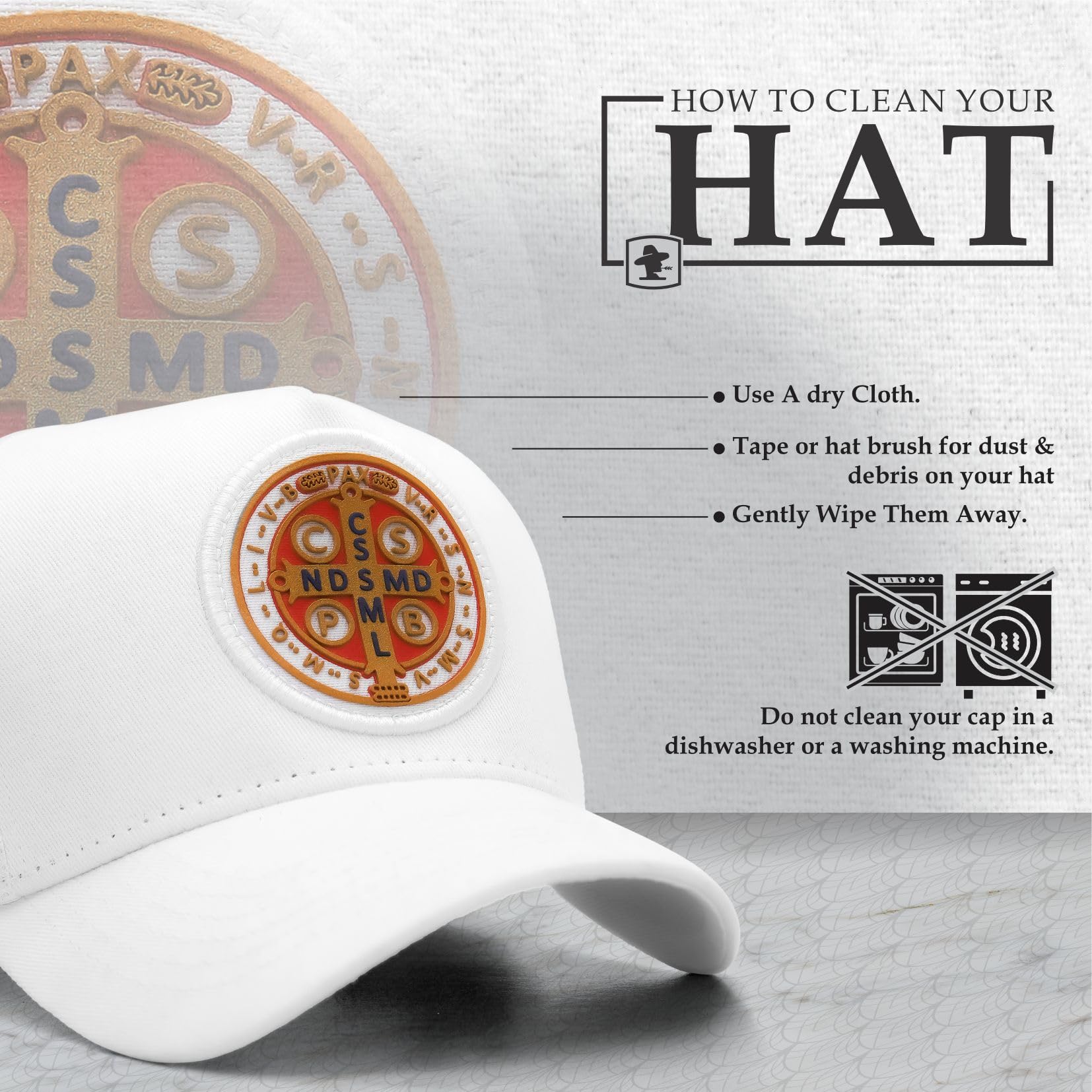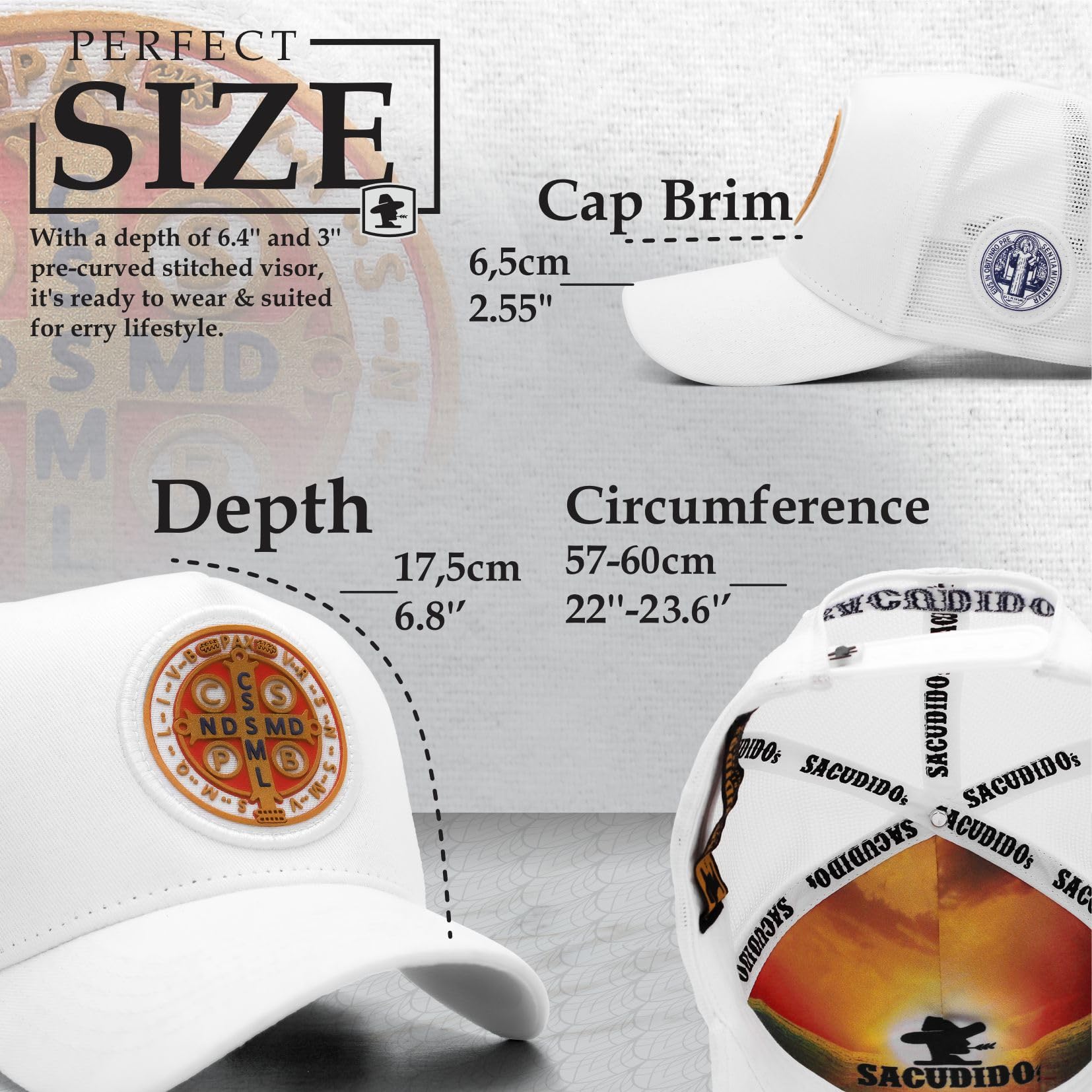 ABOUT THE PRODUCT: The Sacudido's cap featuring Saint Benedict for men and women is exceptionally comfortable and durable. Made with a premium blend of polyester mesh and suede fabric, it includes a laser-designed front pach, soft sweatband, custom internal lining, high-durability mesh, reinforced stitching, and an adjustable strap for a perfect fit.
