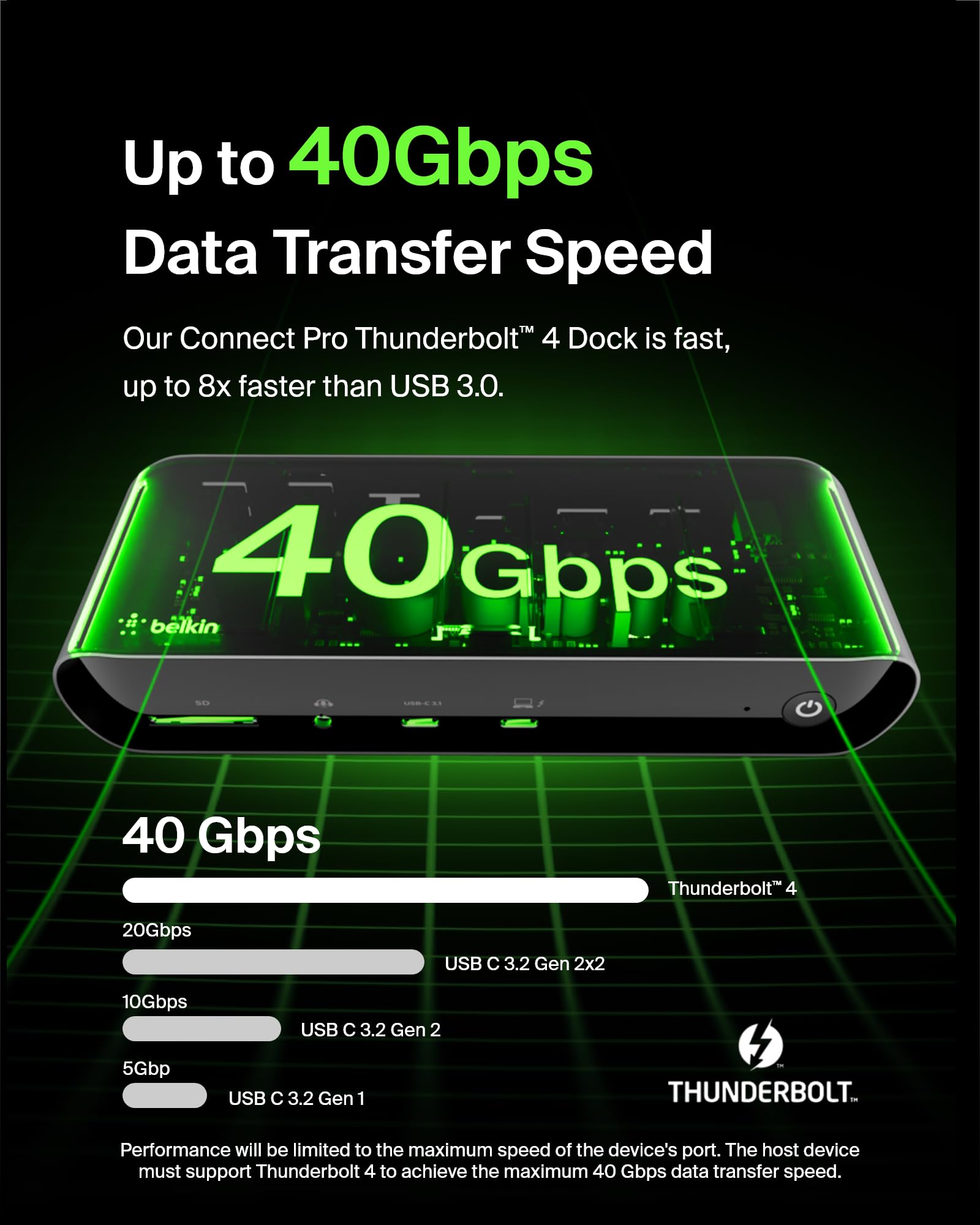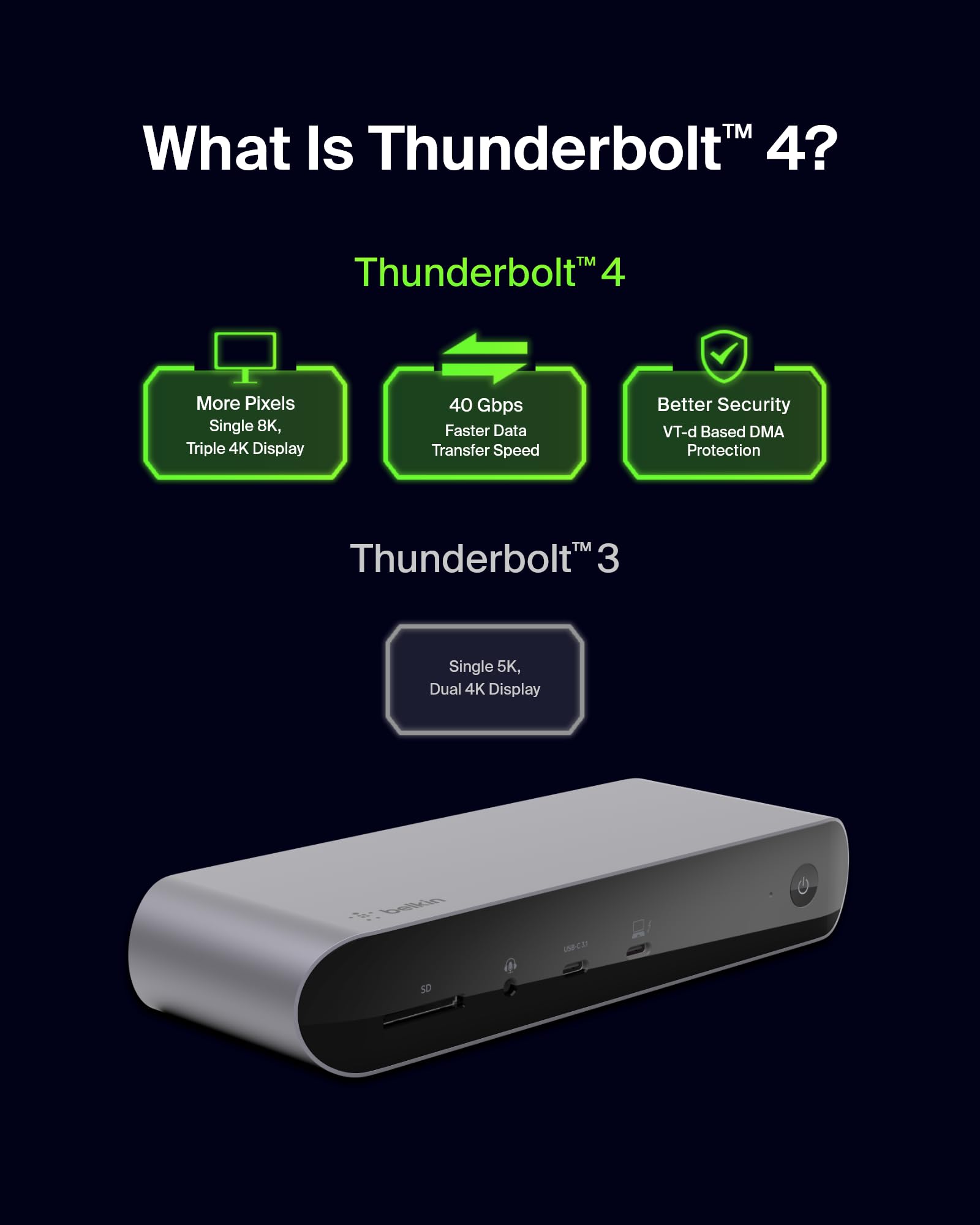 Cater to all your connectivity needs with the Belkin Thunderbolt 4. The ultimate docking solution for your Mac or Windows laptop, it has 12 ports to connect your MacBook or Windows laptop to multiple devices, video, ethernet, and power through a single Thunderbolt 4 cable – enough to receive recognition from entities such as The Verge and Forbes. Get up to 40Gbps data transfer speeds—that’s 8x faster than USB 3.0. Charge your laptop and other connected devices simultaneously with up to 90W of Power Delivery. Immerse yourself in a smoother and clearer visual experience with top-tier video resolutions on as many as three additional displays. Included Thunderbolt 4 cable is compatible with Thunderbolt 3, USB-C, and USB4. Enjoy easy access to monitors, networks, power and peripherals: SD Card Reader, Audio In/Out, USB-C 3.1 Gen 2 port supports Fast Charging PD 3.0 , Thunderbolt 4 port, Power in, 2x HDMI 2.0, Gigabit Ethernet, 2x USB-A 3.1 ports, 2x USB-A 2.0 ports. Note: Docking Station supports up to 3 extended displays. Display compatibility is limited based on host and OS. Verify host compatibility and required connectivity. M1-based MacBook computers can only enable one extended screen; Intel-based MacBook computers require a USB-C to video adapter to enable two extended screens.