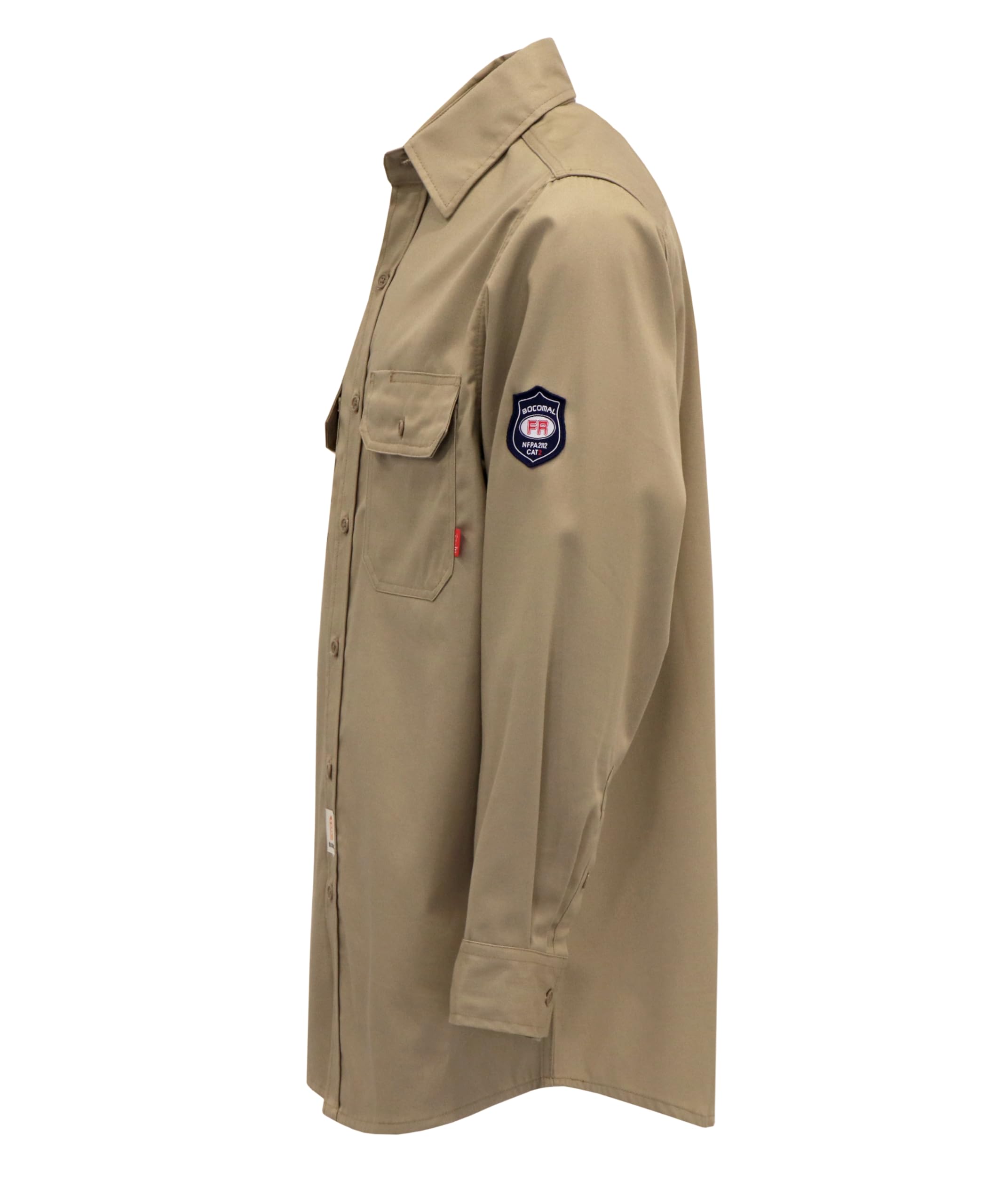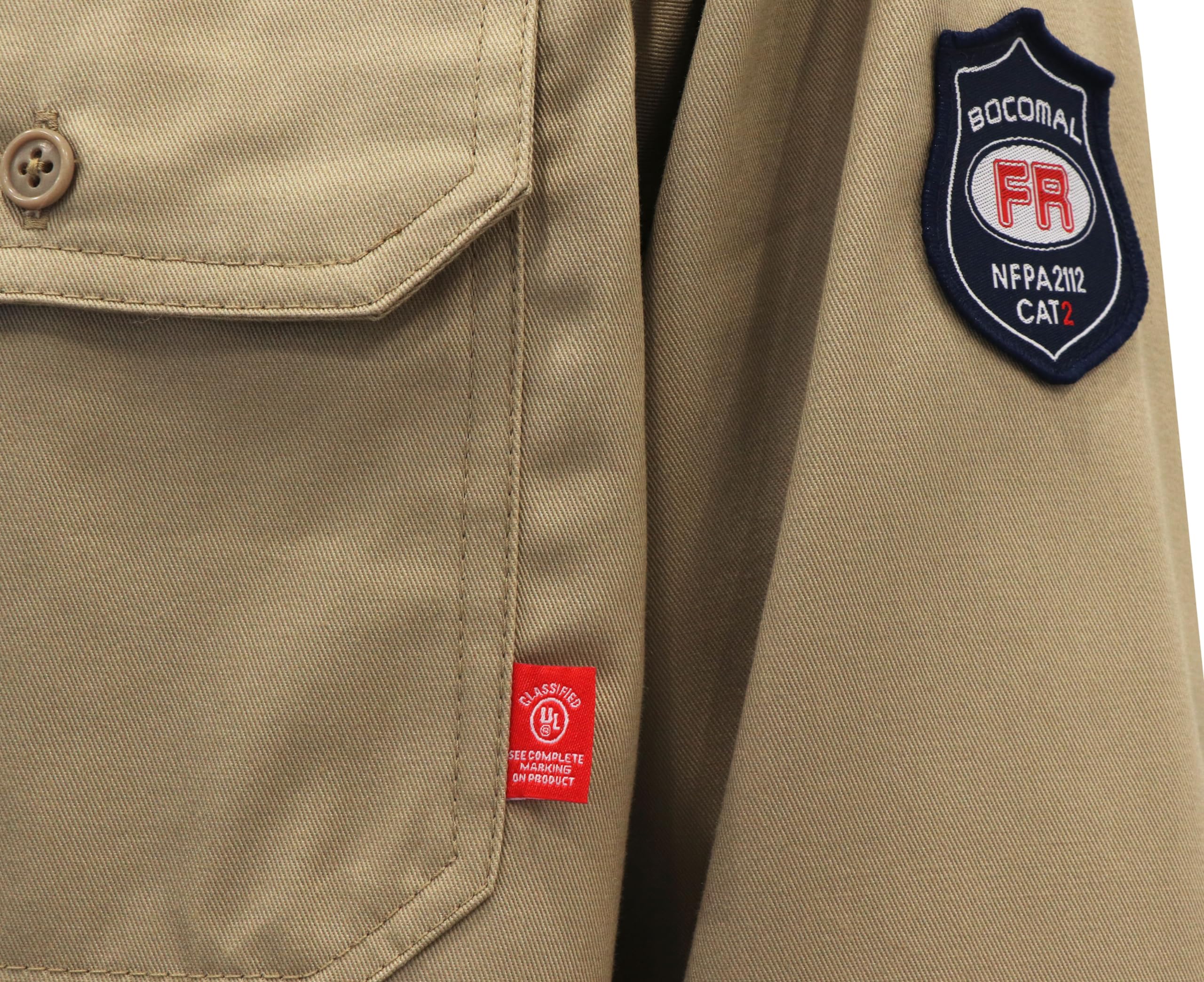 FR MATRIALS LIGHT WEIGHT:Light Water/Rain Repellent and Oil/Stain Resistant 6.25oz Cotton Twill FR Treated,FR Buttons,FR Sewing Threads!Clear FR Tag on arms and bottom front.More FR info On Neck Tag about UL Certification.We Attached A Small Sample Inside Package For Customers Simple FR Try
