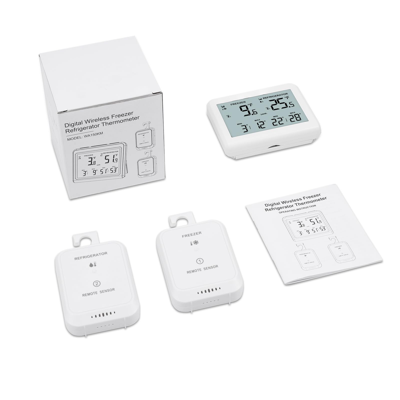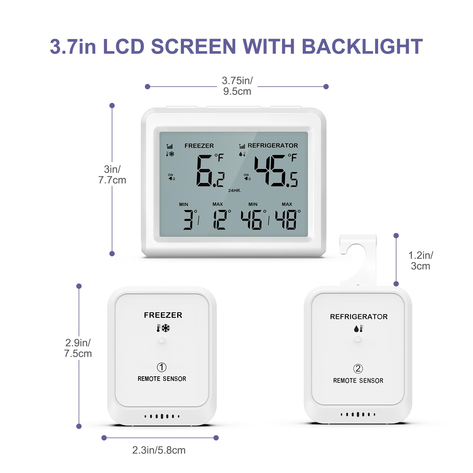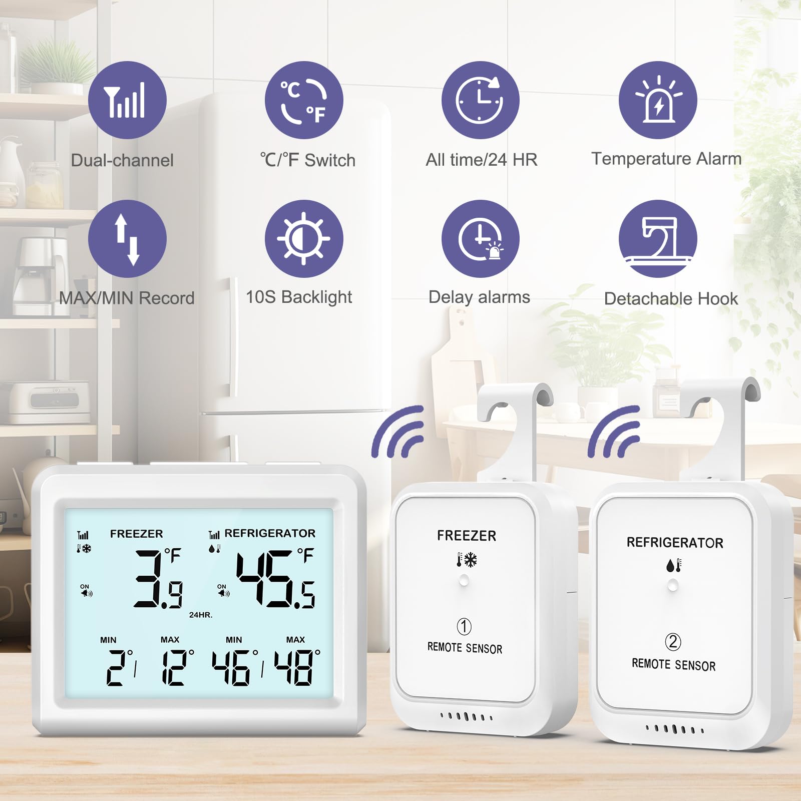 Precise and Reliable Monitoring with 2 Sensor: Keep a close watch on your refrigerator and freezer temperatures with this digital thermometer. Equipped with two wireless sensors, it provides accurate and real-time readings, ensuring your food stays fresh and safe. It's a must-have for home, restaurants, and cellars.