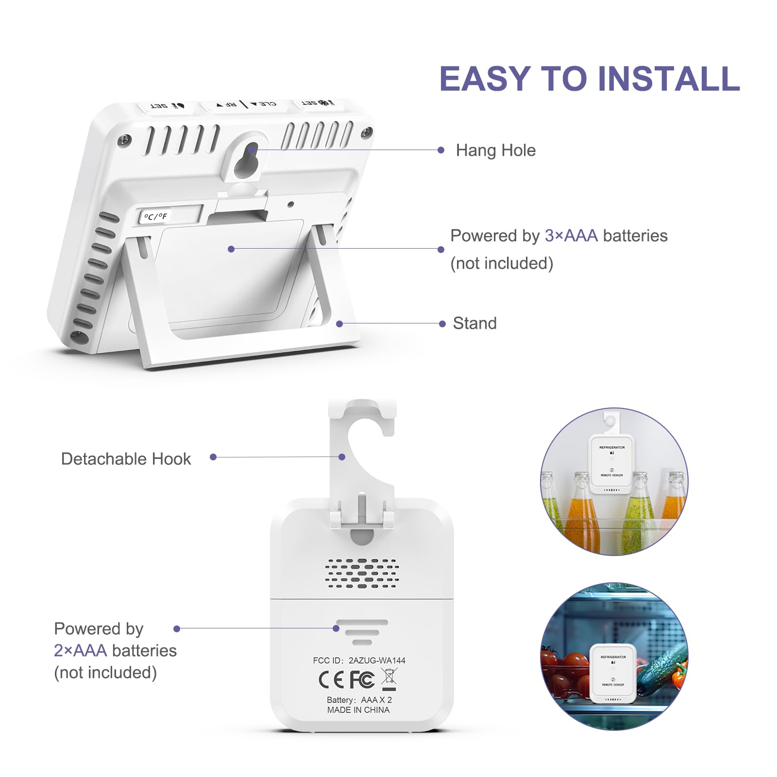 Easy to use: Operating this wireless temperature sensor for refrigerators and freezers is straightforward, requiring just five buttons. The base station is powered by 3 AAA batteries, while each sensor uses 2 AAA batteries (batteries not included). The main unit can be easily mounted on a wall or placed upright, and the transmitters come with hooks for effortless installation on your fridge or freezer, providing versatile setup options to fit any kitchen layout.
