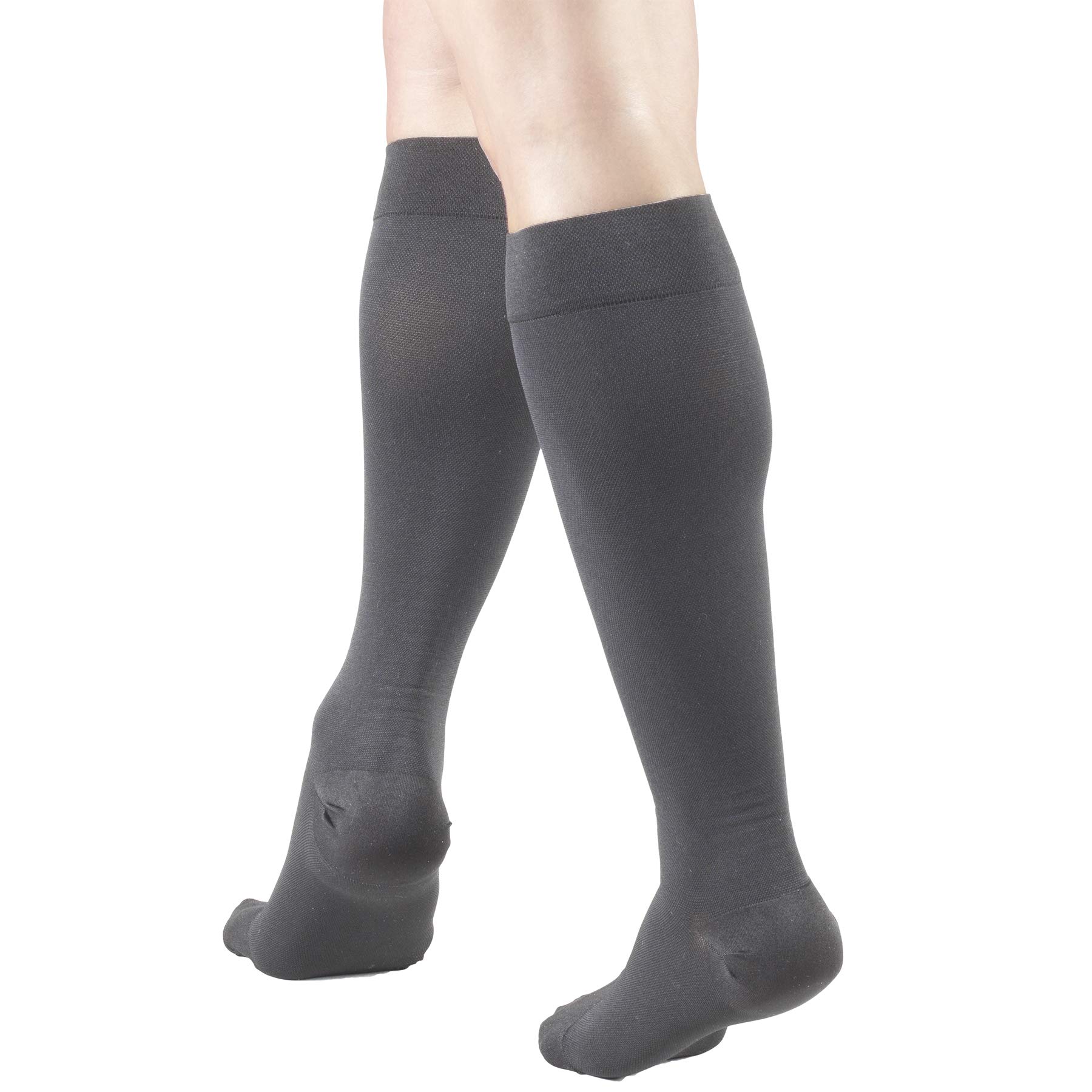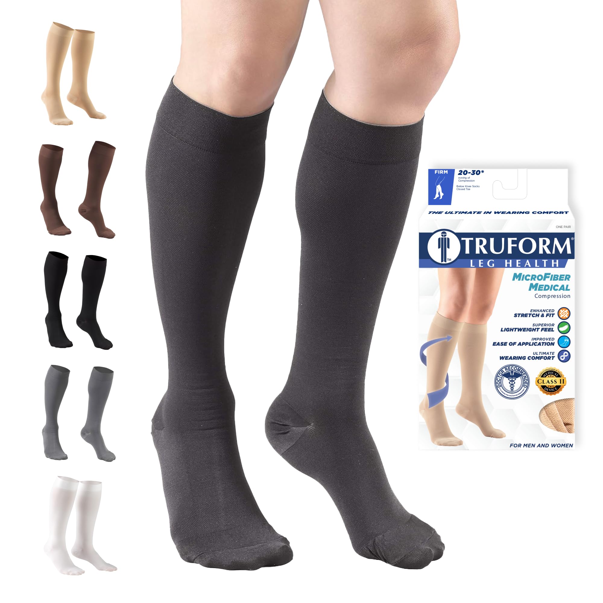 Product Description Truform 8865 was created to help treat conditions associated with poor circulation. Graduated compression technology delivers a compressive action to the leg that is greatest at the ankle, then gradually decreases toward the heart. The 20-30 mmHg Firm compression level is great for post surgery and severe edema, varicose veins, ypotension, post thrombotic syndrome (PTS), post sclerotherapy, and more. Truform therapeutic medical stockings feature classic styling and a smooth knit fabric that helps conceal unsightly conditions. The closed toe offers a more natural stocking feel. Color options are basic neutrals for all-occasion wear. Truform stockings, socks and pantyhose feature Graduated Compression Technology, which delivers a compressive action to the leg that is greatest at the ankle, then gradually decreases toward the heart. Graduated compression provides two primary benefits: it helps treat and lessen swelling for the wearer, and the compression action help to treat the slowing of blood flow so it can flow more quickly up the leg back toward the heart. Truform graduated compression support hosiery helps maintain positive circulation and leg health. We take the extra time and effort necessary to insure a therapeutically effective, comfortable fit. The combination of state-of-the-art materials and equipment, plus knitting know-how sets Truform apart from the crowd to make your legs look and feel great. Choose short length size when length from heel at floor to back bend of kne measures less than 15 inches. Manufacturer Contact Information 3960 Rosslyn Dr, Cincinnati, OH 45209