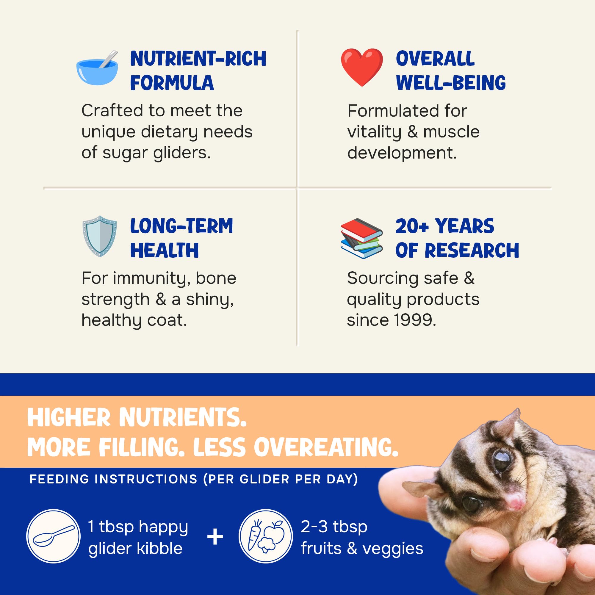 LOADED WITH VITAMINS: We know exactly what sugar gliders need to stay healthy. Each pellet contains calcium, vitamin D3, and probiotics to keep bones strong and coats shiny. The fortified formula supports their natural defenses and helps prevent the bone problems that can happen with poor pet diets. This comprehensive nutrition includes minerals that promote dental health, vision clarity, and reproductive wellness for gliders in all life stages from juvenile to senior years.