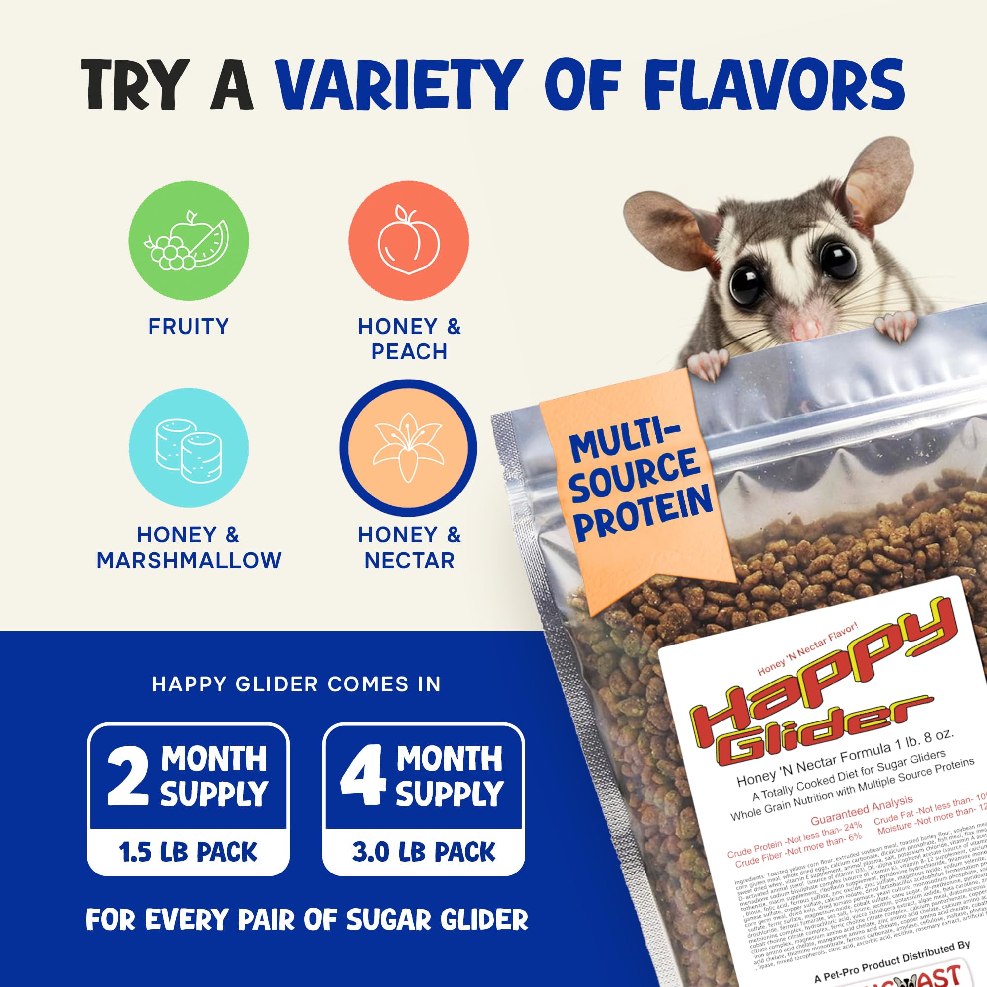 Happy Glider Sugar Glider Food gives your glider everything they need for daily nutrition. This pelleted food combines real animal protein from chicken meal, fish meal, and whole eggs with essential vitamins, minerals, and calcium. The totally cooked process makes it gentle on their stomach while packing in the nutrition they actually need, and it comes in tasty flavors like fruity, honey marshmallow, honey nectar, and honey peach that even picky eaters go for. The pellets stay fresh way longer than powdered foods and make feeding time cleaner with no more scrubbing messy bowls, plus your sugar glider gets consistent energy and improved digestion, especially if you've been struggling with a picky eater or stomach issues. Suncoast Sugar Gliders has been making this exact recipe since 1999 - thousands of glider families use it daily, and vets recommend it because the ingredients are human-grade quality with probiotics for bone strength, shiny coats, and overall pet wellness. The formula includes natural oils and added fiber that promote healthy digestion, while the irresistible taste ensures consistent eating habits. Just serve it alongside fresh fruit and vegetables, and you're set. It works great for gliders of any age once weaned and supports their natural nocturnal lifestyle and energy needs. Ideal for exotic pet owners who want reliable small animal food that takes the hassle out of feeding their sugar gliders properly while providing complete nutrition that pets love to eat daily.