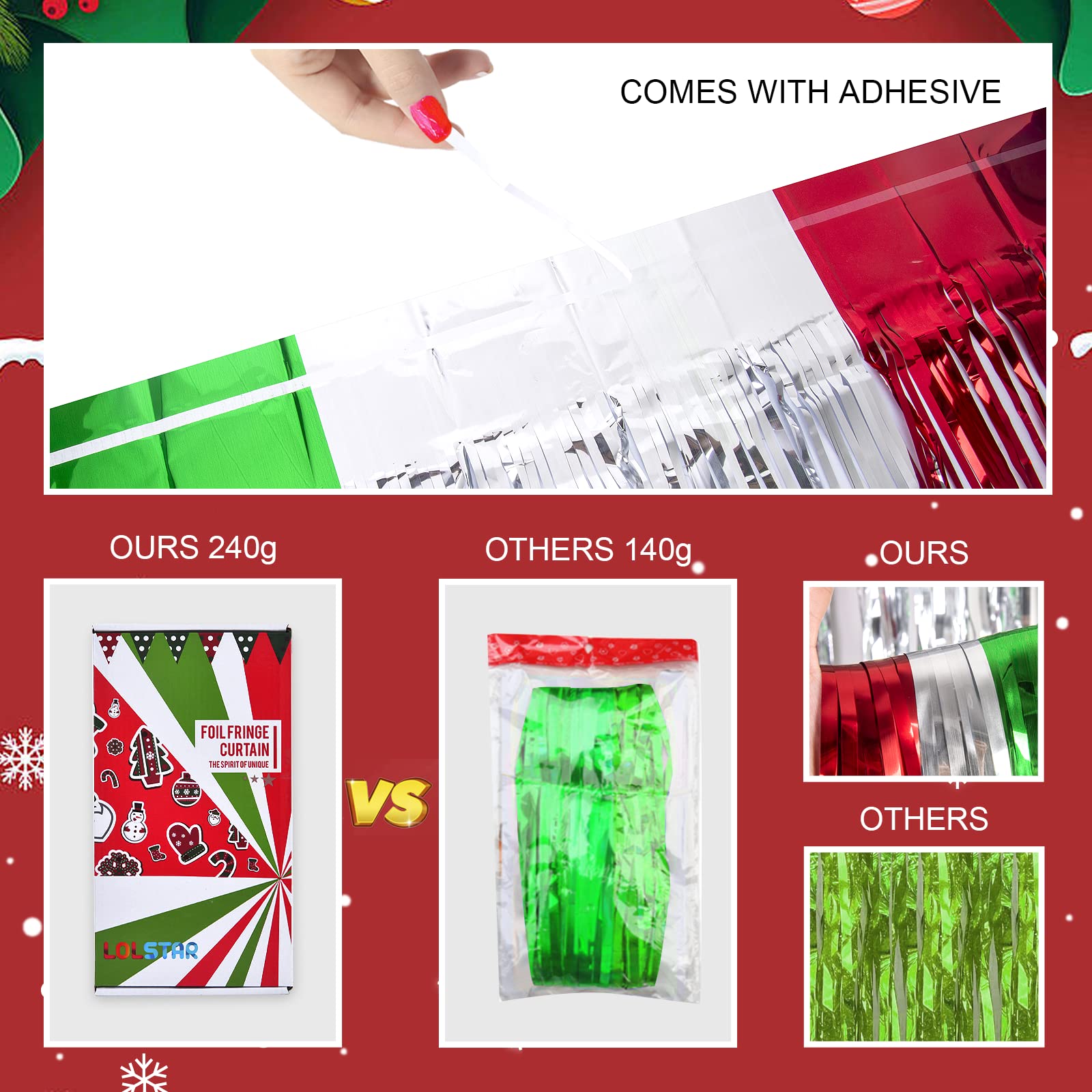 WIDELY APPLICATIONS: These red silver and green foil fringe curtains backdrop are a wonderful finishing touch for any party such as a Christmas carnival party, New Year's Eve party, Friendsmas party, Ugly sweater party, birthday party, anniversary party, wedding party, engagement party, graduation party decorations, they are also suitable for photo backdrop, stage background, disco, baby shower, bridal shower, etc.