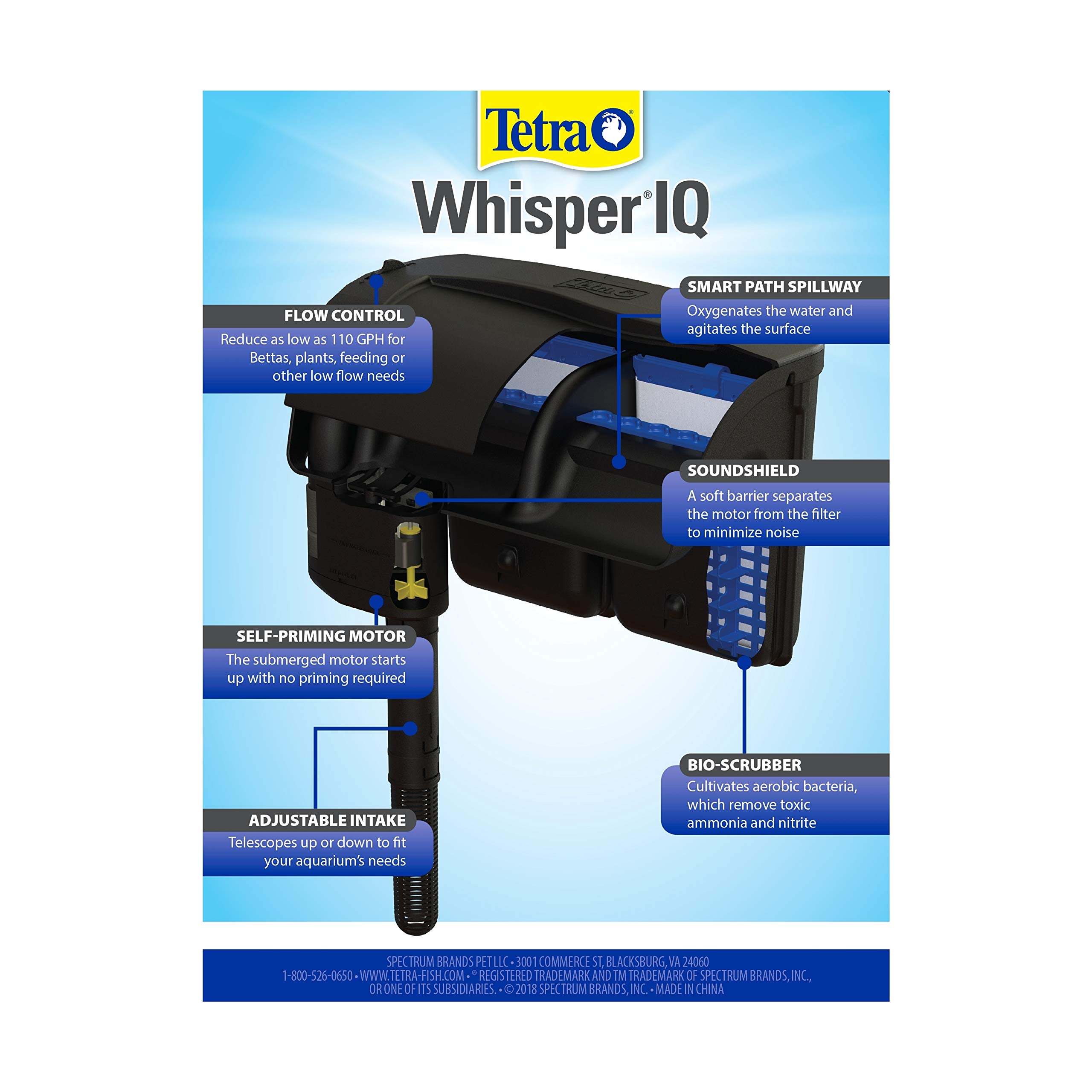 The Tetra® Whisper® IQ Power Filter with Stay Clean™ technology keeps aquarium water clean and clear. This quiet filter contains a soft barrier between the motor and the filter that serves as a sound shield to minimize noise. The bio-scrubber cultivates aerobic bacteria to remove toxic ammonia and nitrite, and the smart path spillway oxygenates the water and agitates the surface. With a self-priming, submerged motor and adjustable intake to fit your aquarium’s needs, the Tetra Whisper IQ Power Filter is perfect for use with both freshwater and marine fish. Works with easy-to-change Tetra Whisper Bio-Bag® Filter Cartridges with Stay Clean technology – helps reduce buildup on aquarium glass, bind small dirt particles to make them easier to filter and stabilize pH levels to prevent crashes, meaning easier aquarium maintenance for you. Tetra Whisper IQ Power Filters are available in a range of sizes to fit your aquarium. This Tetra Whisper IQ 60 Power Filter treats aquariums up to 60 gallons (300 GPH). Convenient color coding makes it simple to choose the correct size replacement cartridge – use with size large Tetra Whisper Bio-Bag Filter Cartridges (blue packaging). Since 1951, Tetra has developed the world’s most comprehensive body of fish food knowledge, and fishkeeping enthusiasts have looked to the brand for products and solutions that add ease and beauty to their home. Whether you're an experienced hobbyist or just starting out, Tetra has everything you need – from a large variety of quality fish food and innovative equipment to test kits and décor.