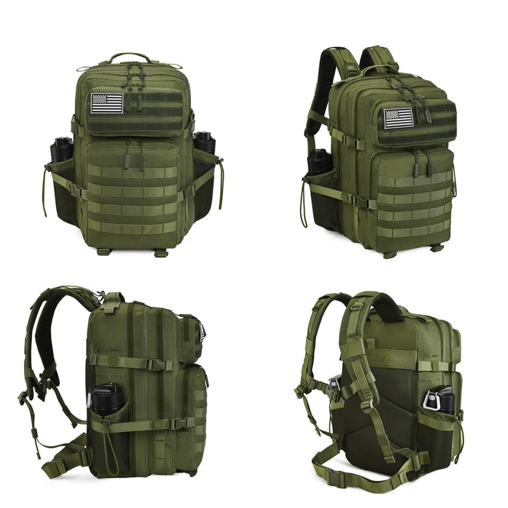This Green Tactical Backpack Molle tactical backpack has molle system, Molle webbing throughout for attaching additional tactical pouches or gear.MilitaryTactical backpack with double-stitched, Heavy duty zippers and utility-style cord pulls, Side and front load compression system, mesh padded back area & shoulder strap.