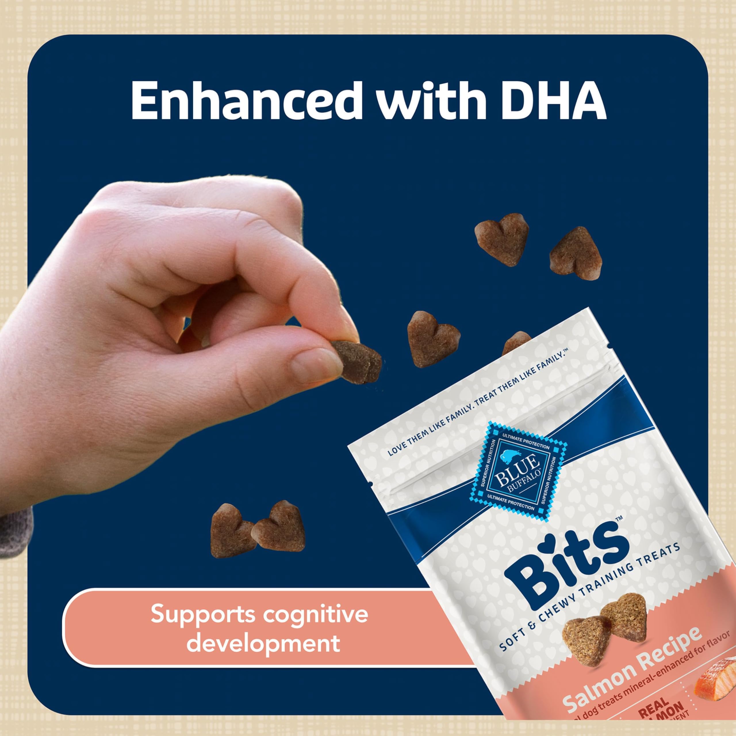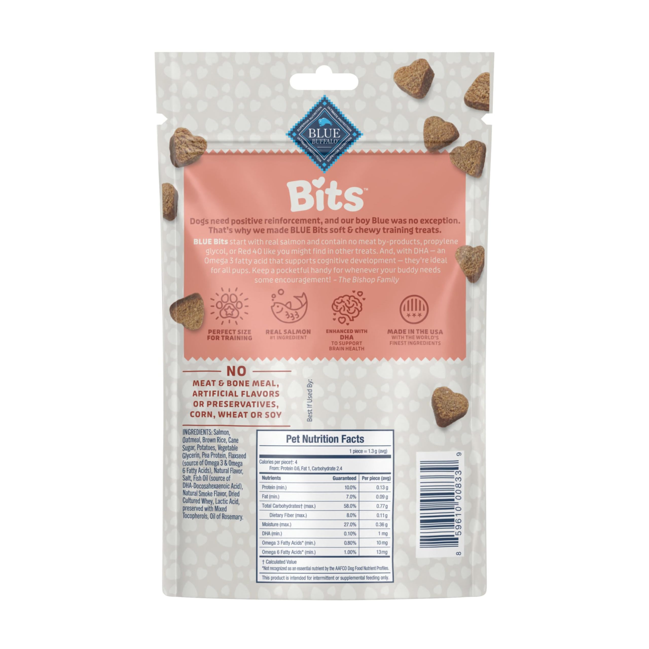 Product Description Reward your best friend with the irresistible taste of BLUE Bits Soft-Moist Dog Training Treats, Salmon Recipe. BLUE Bits training treats are enhanced with DHA to support cognitive development and keep your pet on track with healthy growth and development. And like all Blue Buffalo treats, these everyday dog snacks don't contain any chicken (or poultry) by-product meals. They are also free from corn, wheat, soy and artificial preservatives like propylene glycol and colors like red dye 40. While these dog training treats are packed with health benefits, they are also crafted with real salmon as the first ingredient with a soft-moist texture your dog will go crazy for. From the Manufacturer BLUE Bits are natural dog training treats that are soft, moist and extremely tasty. Perfect for training and perfect for treating, BLUE Bits are a healthy and nutritious reward that your dog will love. Each meaty morsel is loaded with good stuff like: Salmon - A high-quality protein source, DHA - To help support cognitive development in puppies, Omega 3 and 6 Fatty Acids - To help promote healthy skin and coat