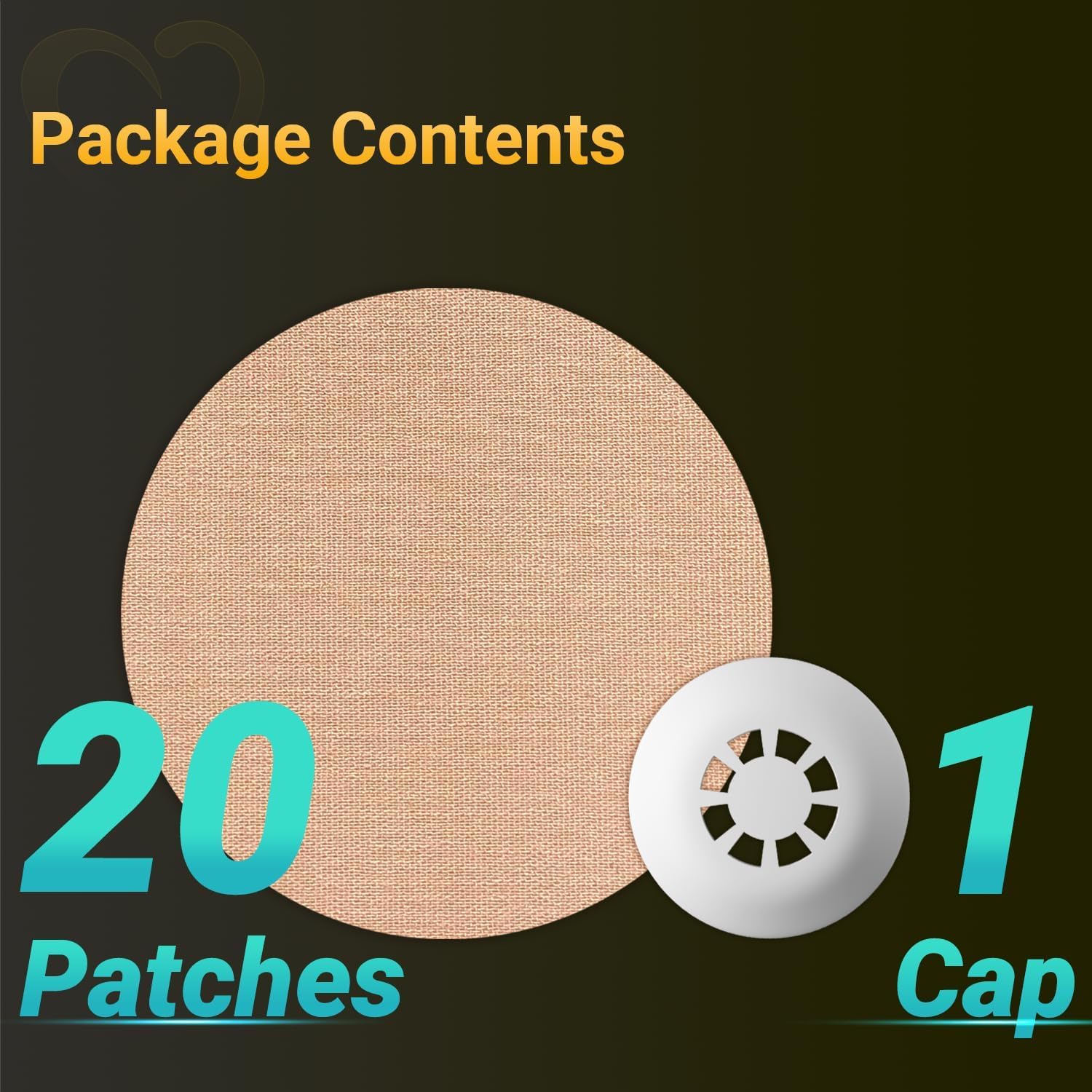 What's in the package: 20 PC adhesive patches, 1 hard shell cap, 1 instruction manual