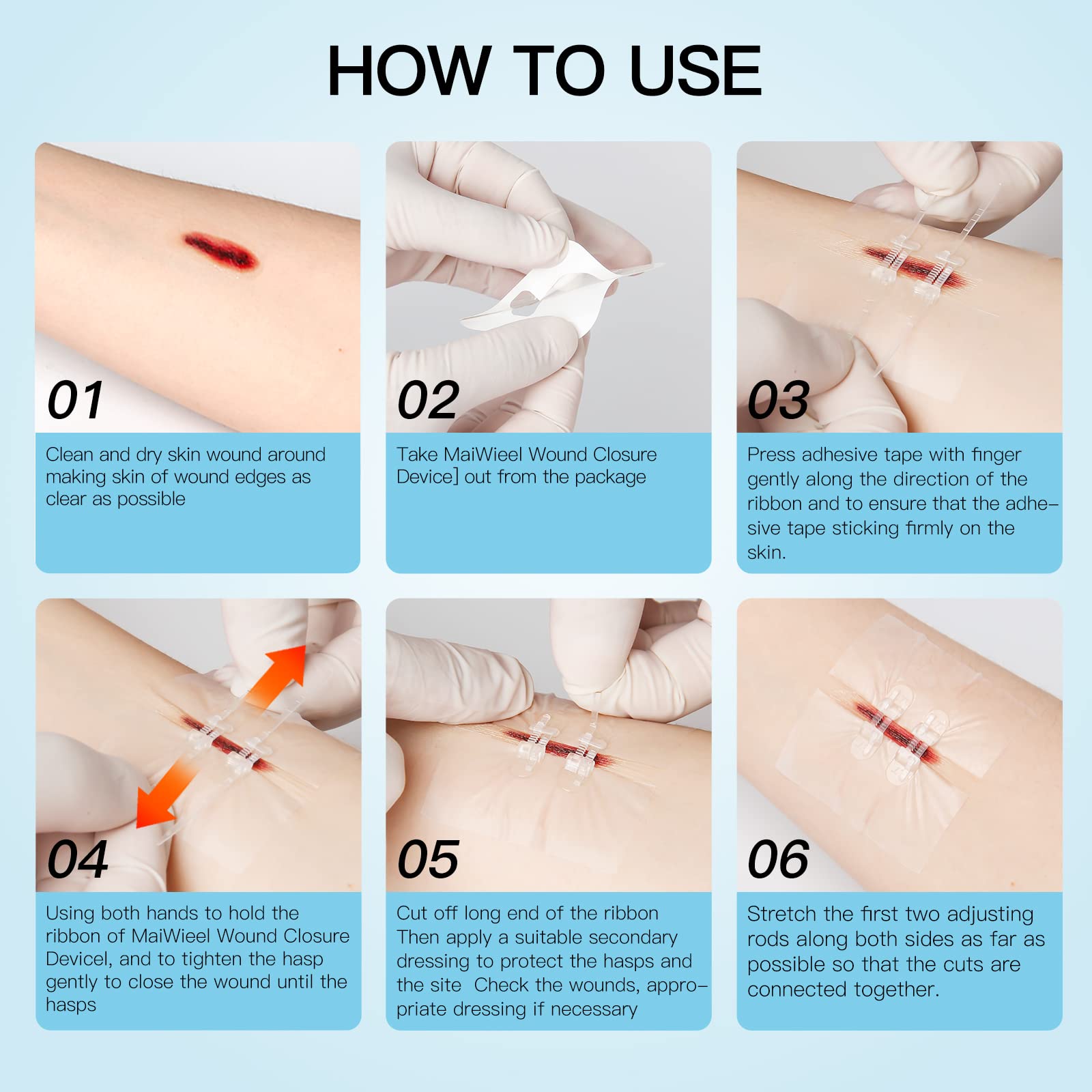 Protection:2 Emergency Wound Closures Device for wound suture-free closure as you need. Convenient to store & carry. A Must-have in all first aid kits (home, office, outdoor, survival,etc). Clean & Dry the skin before application.
