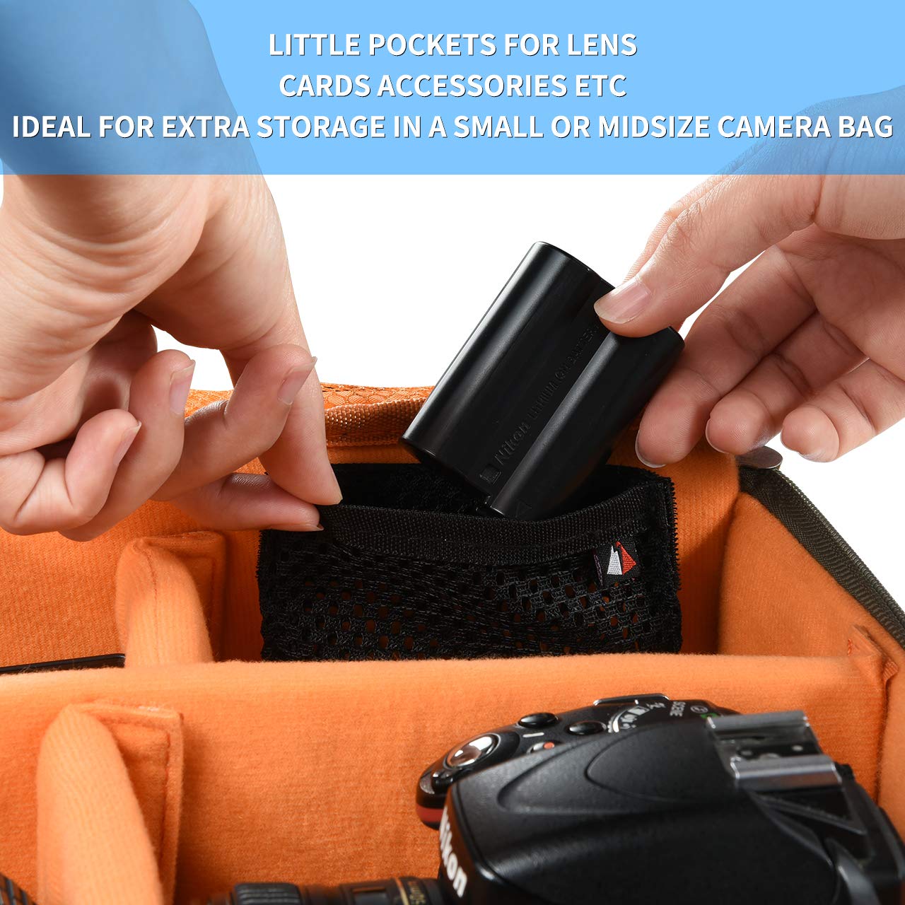 Works great in any camera bag that uses hook and loop and insert; These mesh pocket allow you to properly keep your camera, lenses and accessories safely in place when they are not in use