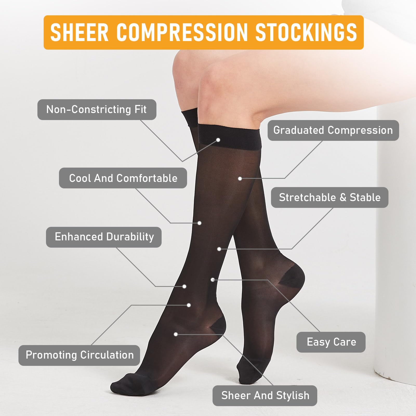 Reinforced Durability: Constructed with attention to detail, our sheer compression stockings feature enhanced reinforcement in the heel and toe areas, providing exceptional durability and extending the life of the sheer stockings.