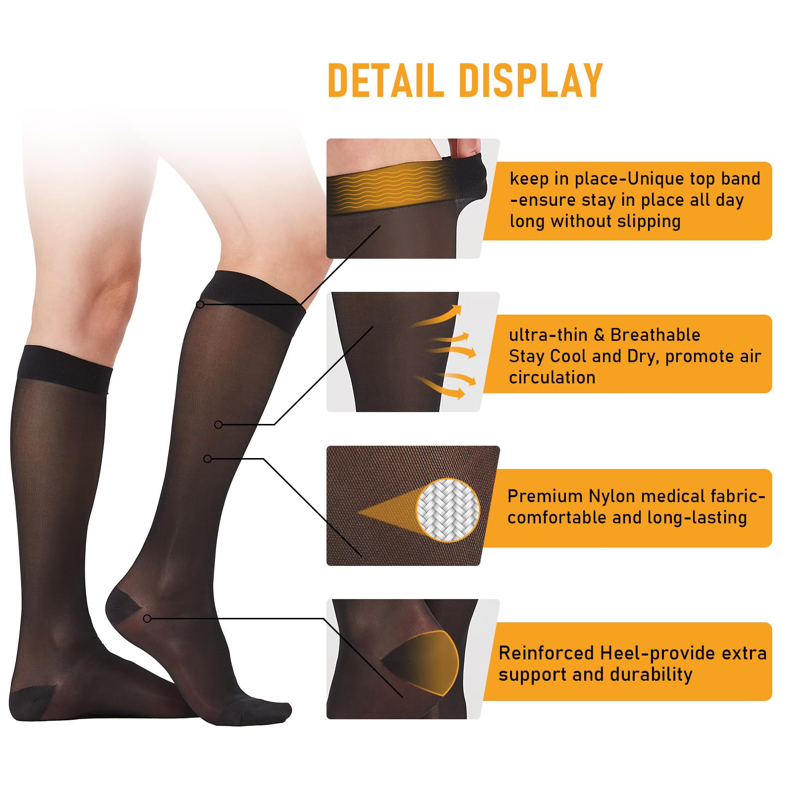 Enhanced Comfort & Stay in Place: Our sheer compression socks for women are crafted with a premium blend of 85% nylon and 15% spandex for breathability and comfort fit to your legs. The non-binding top band promises a snug fit without the discomfort of constriction, keep you feeling cool, making them perfect for all-day wear, even on the hottest summer days. Latex-Free.