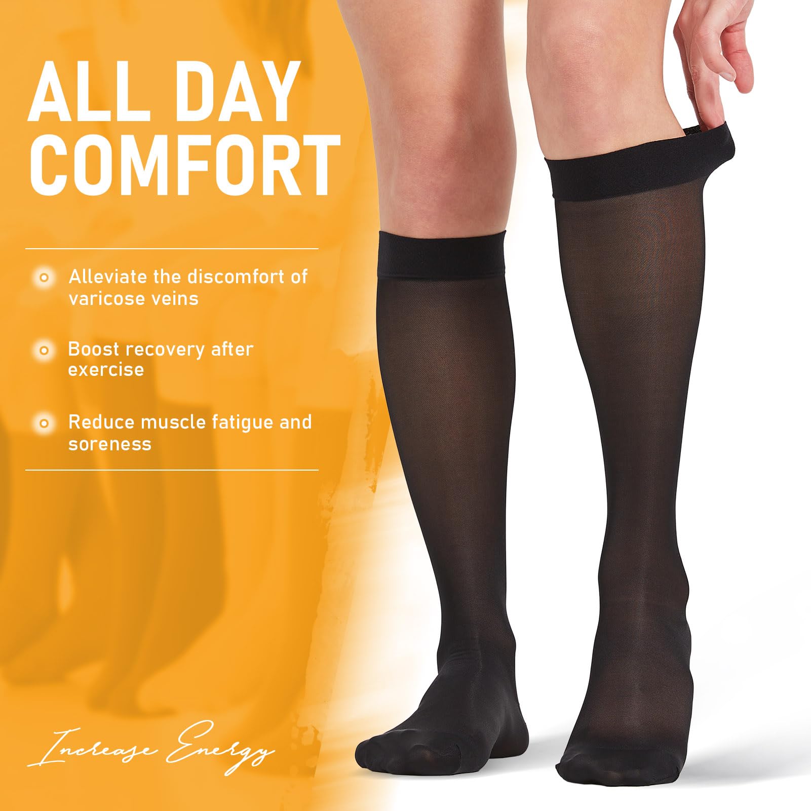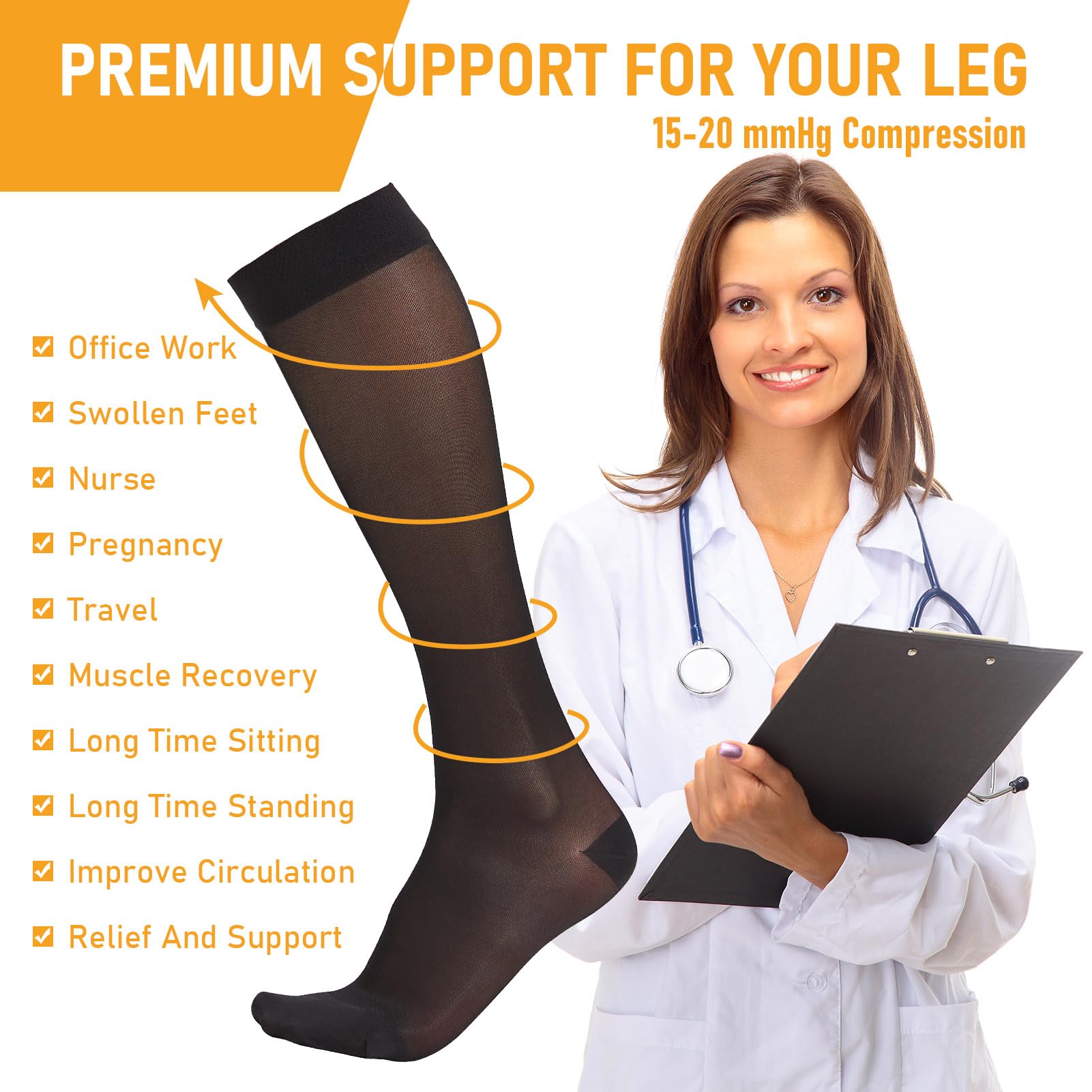 Graduated Compression: Engineered with a 15-20 mmHg graduated compression, these sheer stockings are precision-crafted to boost circulation, reduce fatigue, and alleviate the discomfort of sore aching tired legs, swelling, varicose veins, spider veins, edema, DVT blood, clots and other circulatory issues. They are the ideal companion for frequent travelers, pregnancy, work, office, pregnancy, muscle recovery and professionals who spend long periods standing or sitting.