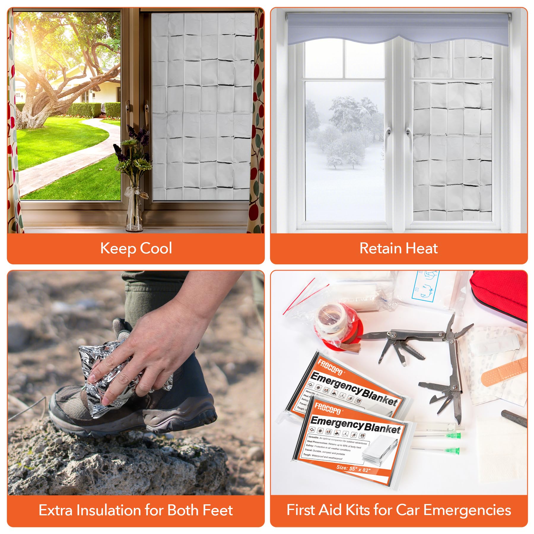 Multipurpose Functionality: These Survival Blankets offer endless possibilities. They can be used as ponchos, emergency tents, shelters, moisture pads, lightweight tarpaulins, sheets, sleeping bags, window insulation, ropes, backpack covers, and more.