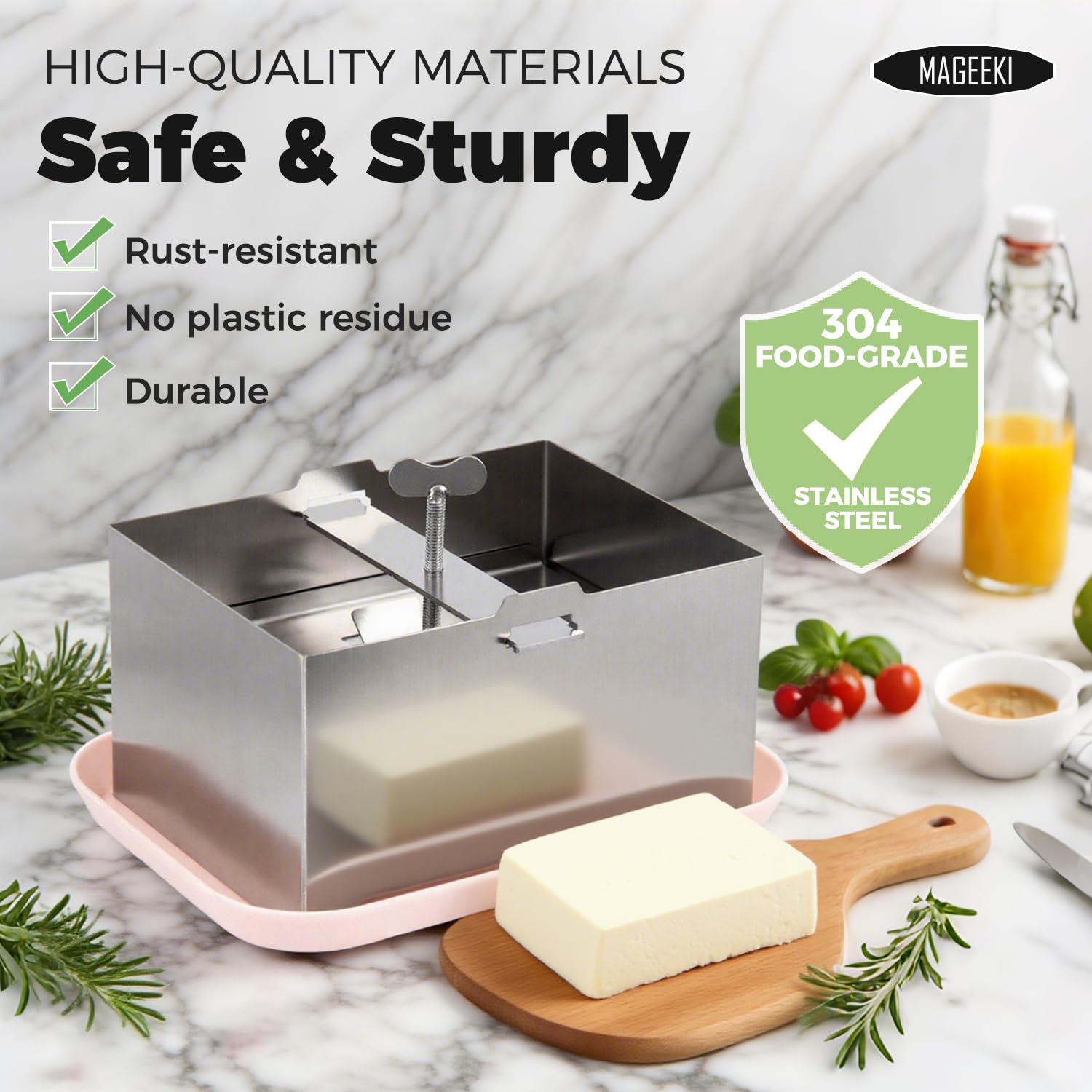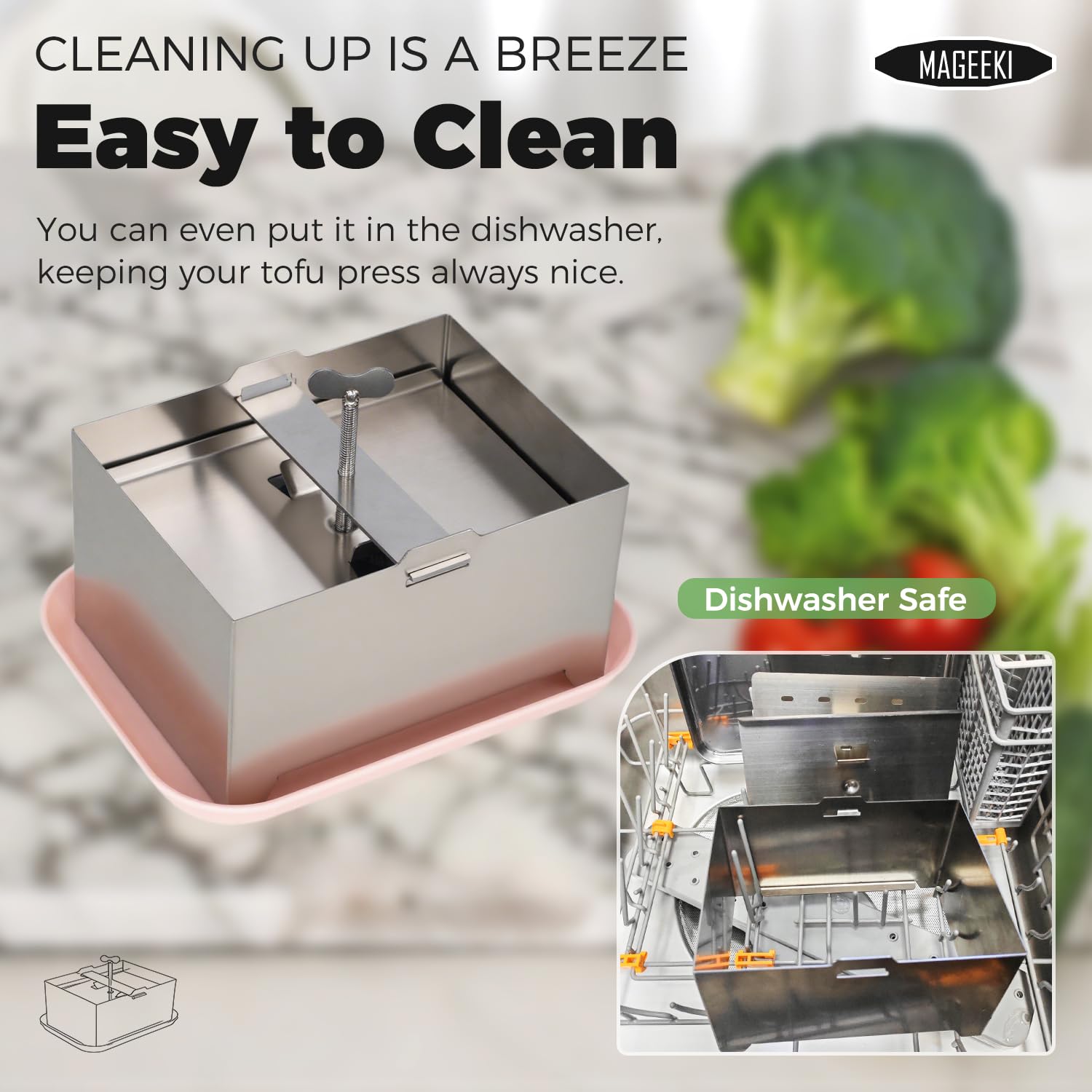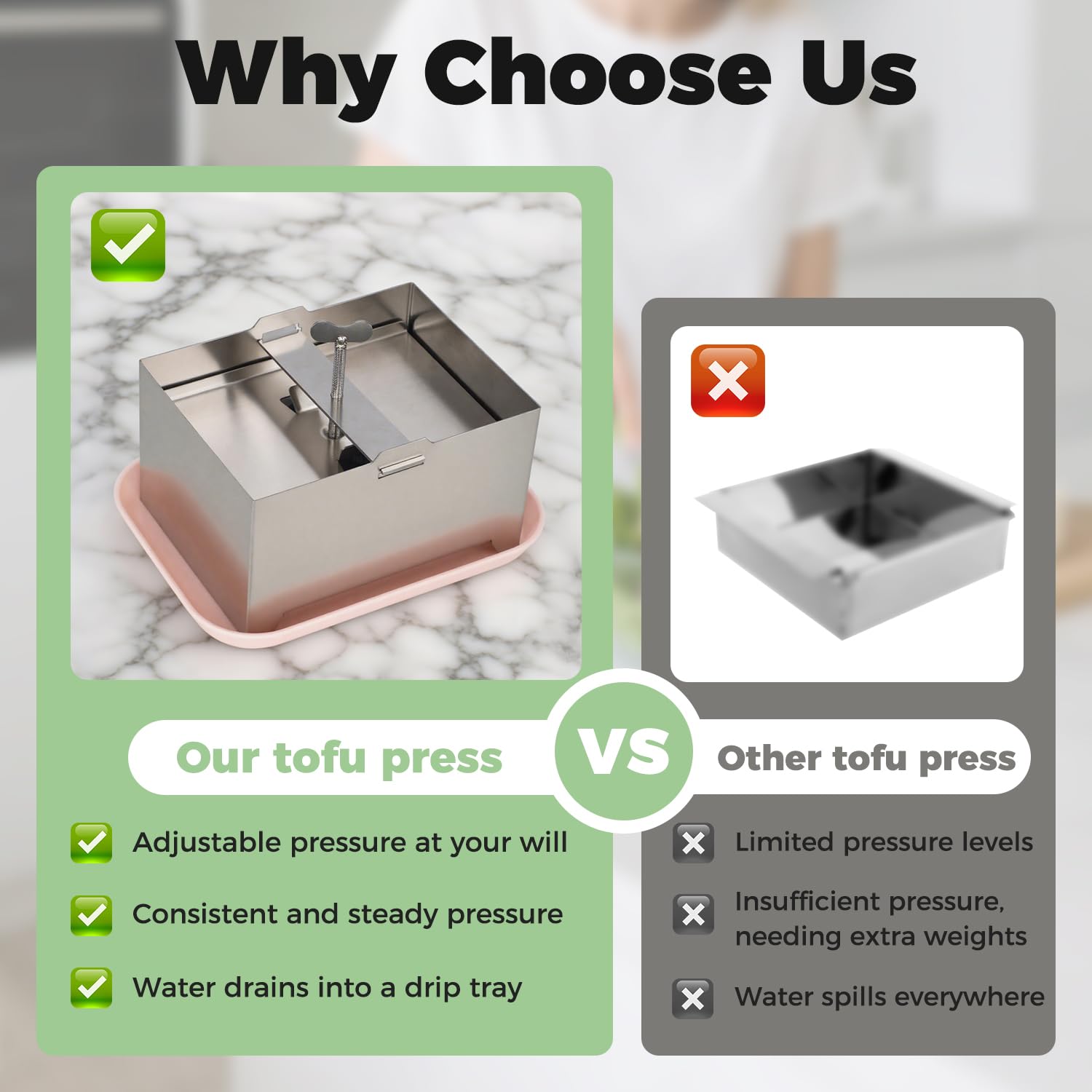 SAFE STAINLESS STEEL BUILD: Our tofu press is meticulously crafted from high-quality food-grade 304 stainless steel, ensuring exceptional durability and longevity. This rust-resistant material is built to withstand the test of time. Unlike plastic, which can crack or break, it provides a reliable and safe solution for all your tofu pressing needs.