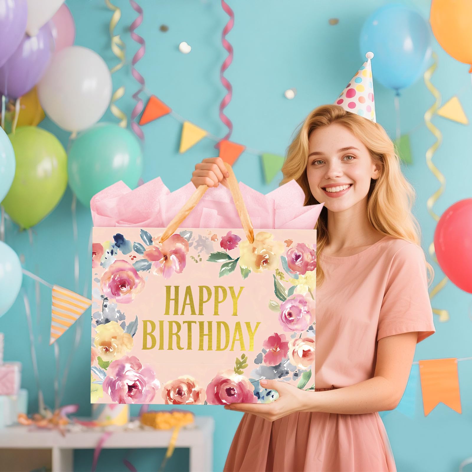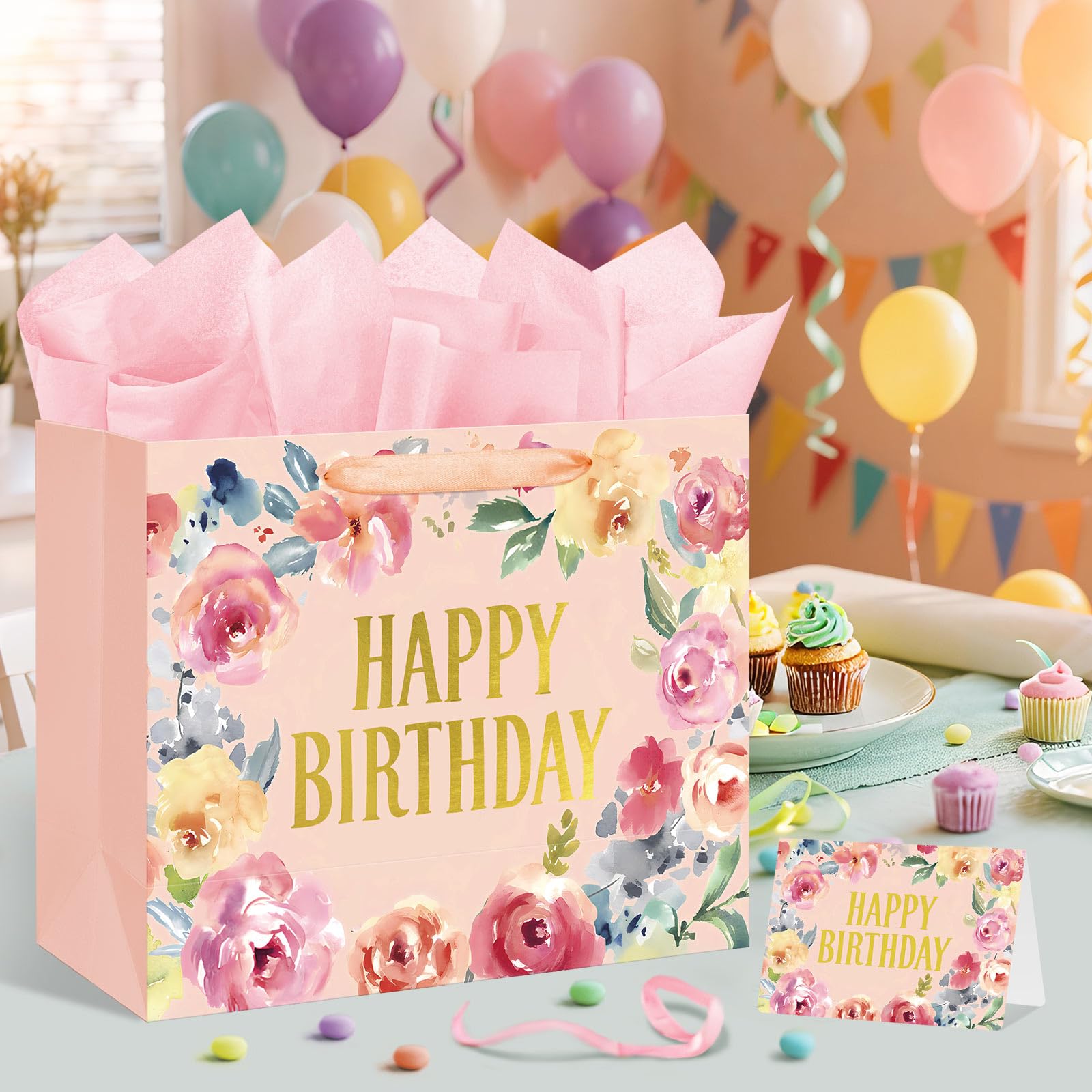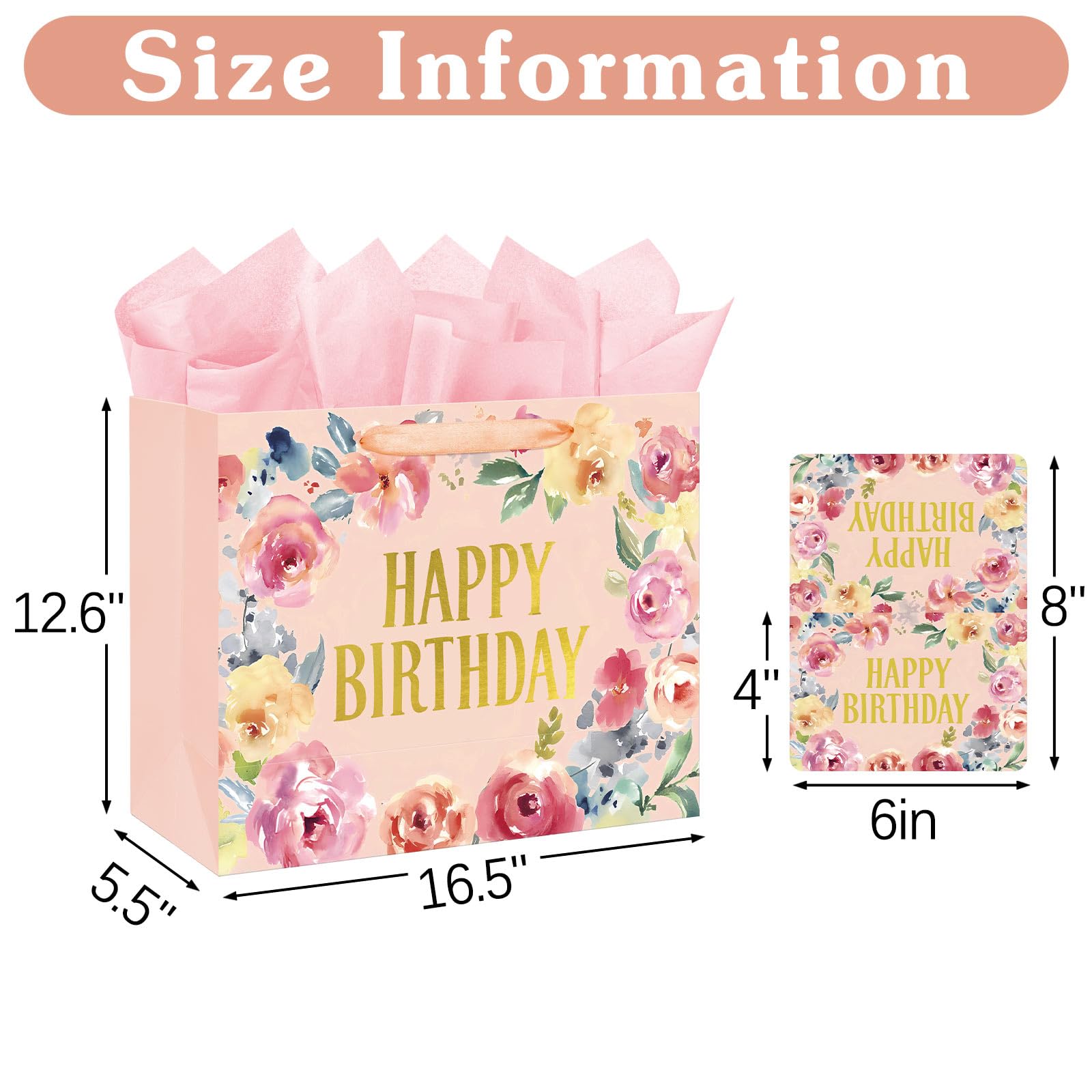 【Perfect Size】16.5" W x 12.6" H x 5.5" D girl birthday gift bag, 8" W x 6" H greeting card.