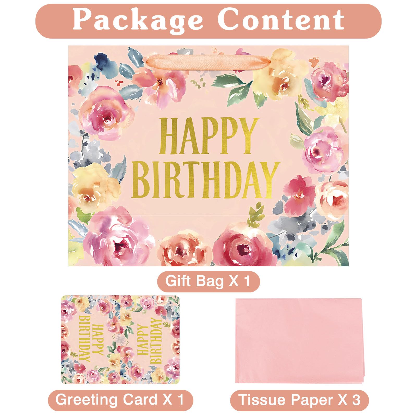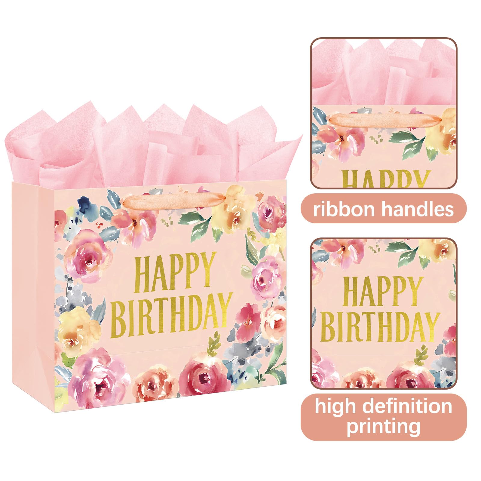 【Features】Super beautiful and vivid floral design makes this birthday gift bag with a pink ribbon handle more charming.