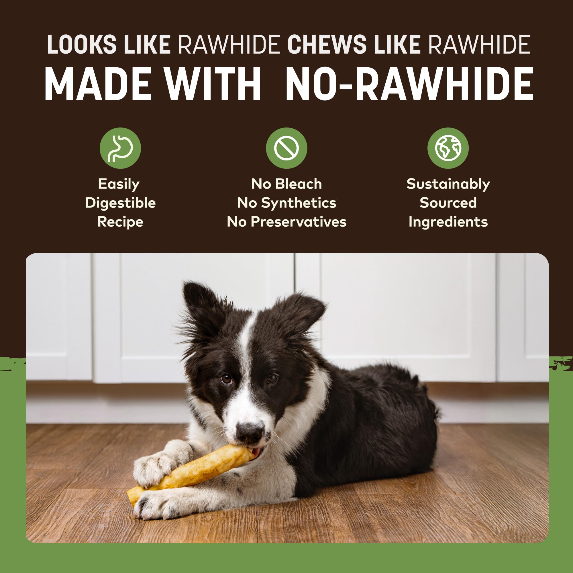 HEALTHY & HAPPY: These yummy alternative rawhides for dogs are free of bleaches, synthetics, & preservatives. Our rawhide free chews are consciously made in the USA with 7 pure ingredients.