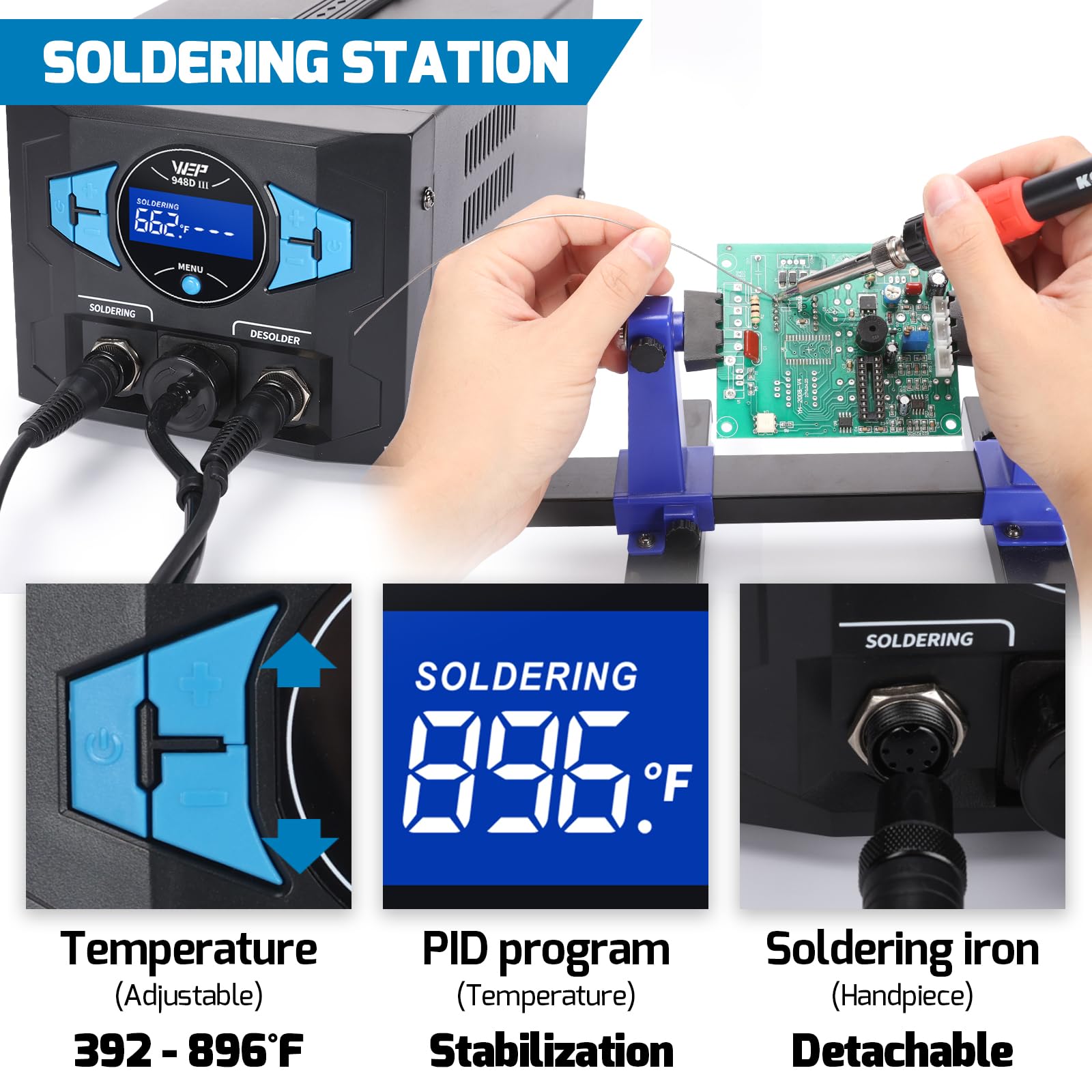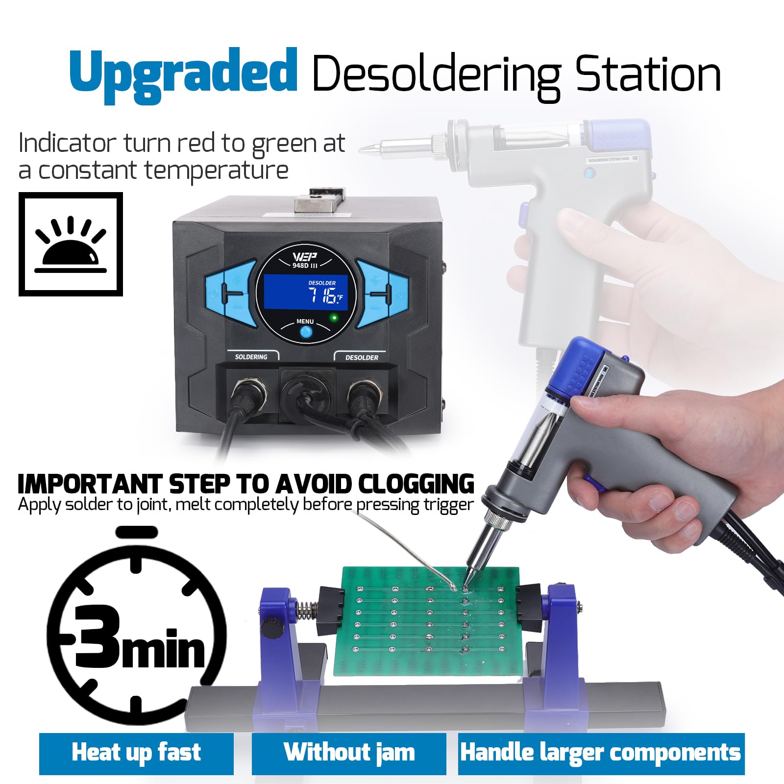 2-IN-1: This multi-station allows you to use a soldering station and desoldering station at the same time. When the solder joints require slightly more heat, you can use the soldering iron and desoldering gun together to heat up the solder joint fully before extracting the melted solder with the desoldering tool