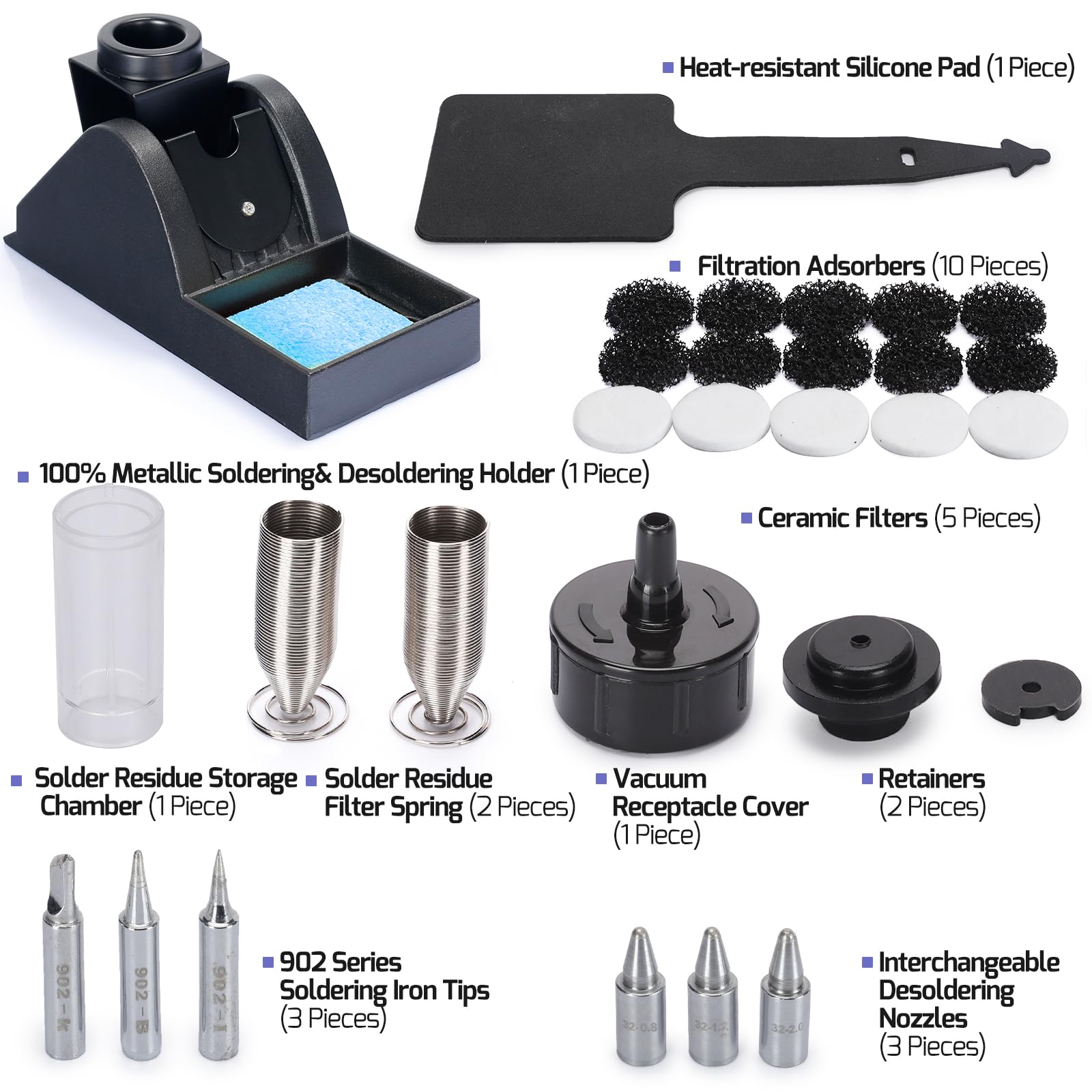 Complete set of accessories: The package includes 3 interchangeable soldering sucker nozzles (1.0mm/1.2mm/2.0mm), 3 soldering tips (Type-I/B/K), 100% metallic soldering & desoldering holder, 5 ceramic filters, 10 filtration adsorbers, a set of cleaning pins, a solder residue storage chamber, a vacuum receptacle cover, 2 solder residue filter spring