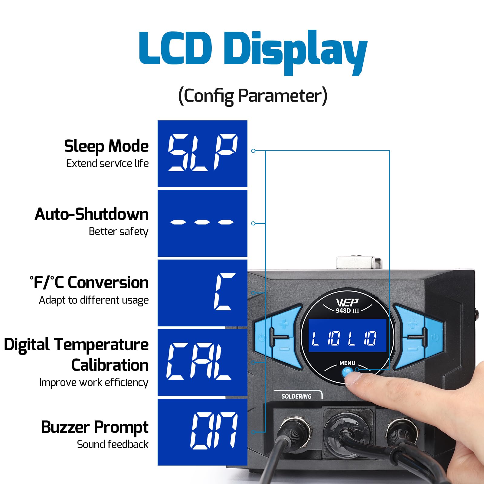 Soldering: The soldering station's 110W heating element can heat up fast during use. Temperature is adjustable from 392~896°F. When heating, the built-in PID program will detect and compensate for the temperature loss every 20 milliseconds to achieve fast temperature recovery. This soldering iron station can apply to most soldering situations, even for larger solder joints