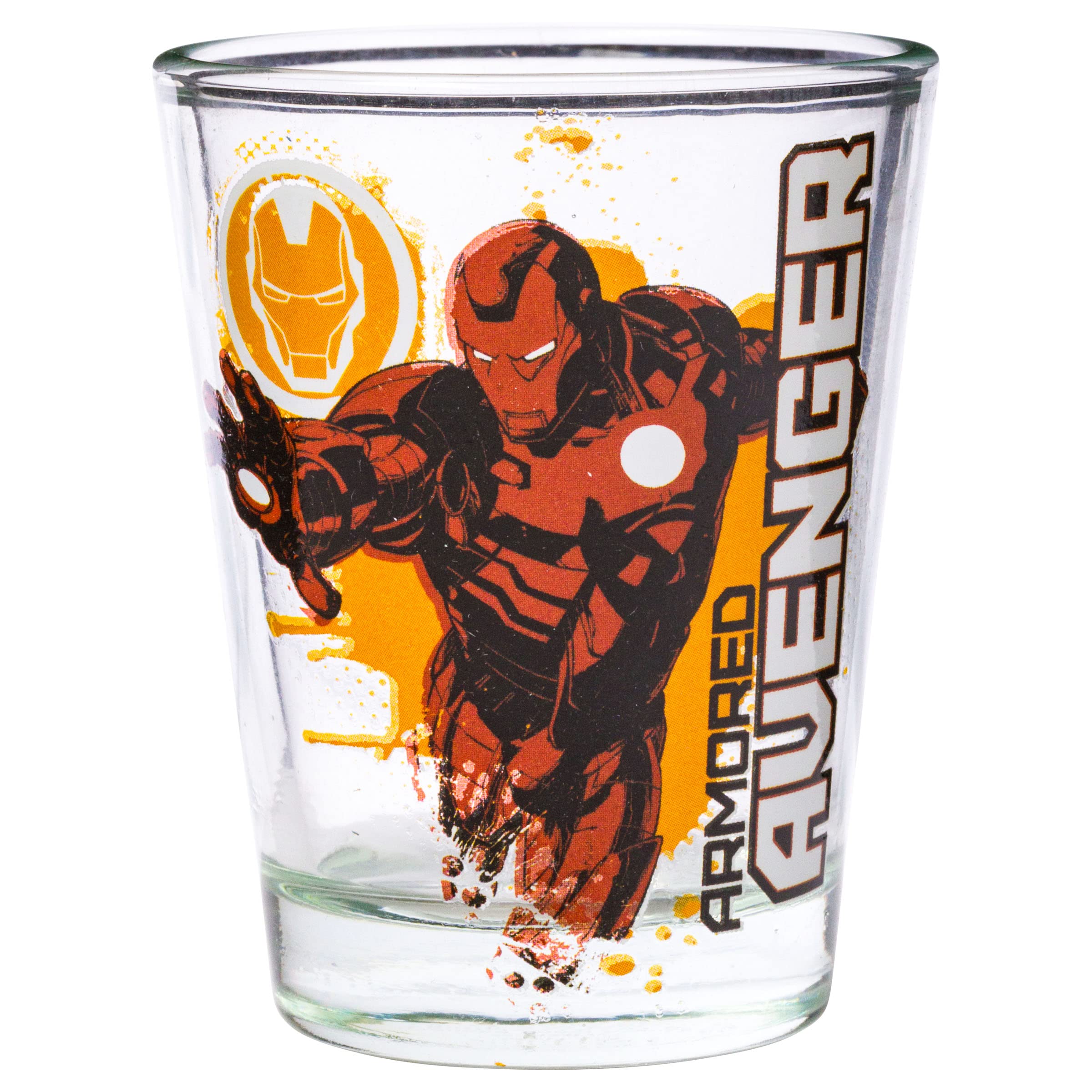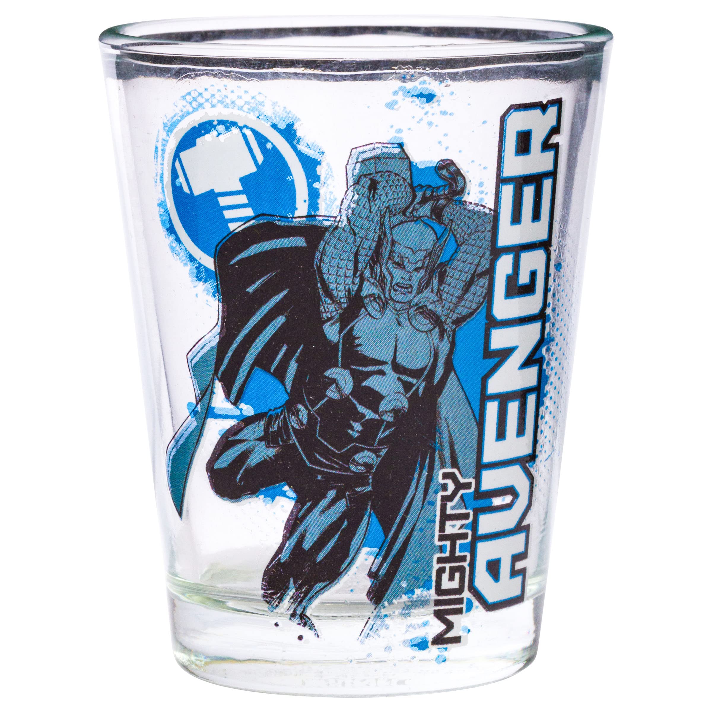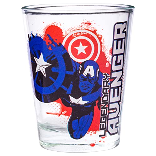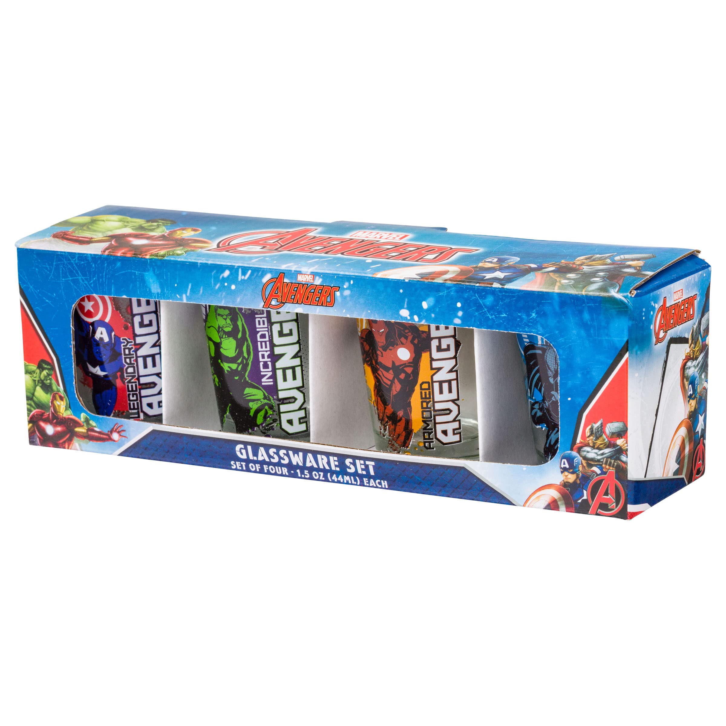 MINI-GLASS SET: This 4-pack of mini-glasses holds 1.5 oz of each of your favorite drinks. Make your party cool with this awesome Avengers 4pc. Mini Glass set of your favorite iconic Avenger characters with a Splatter Background