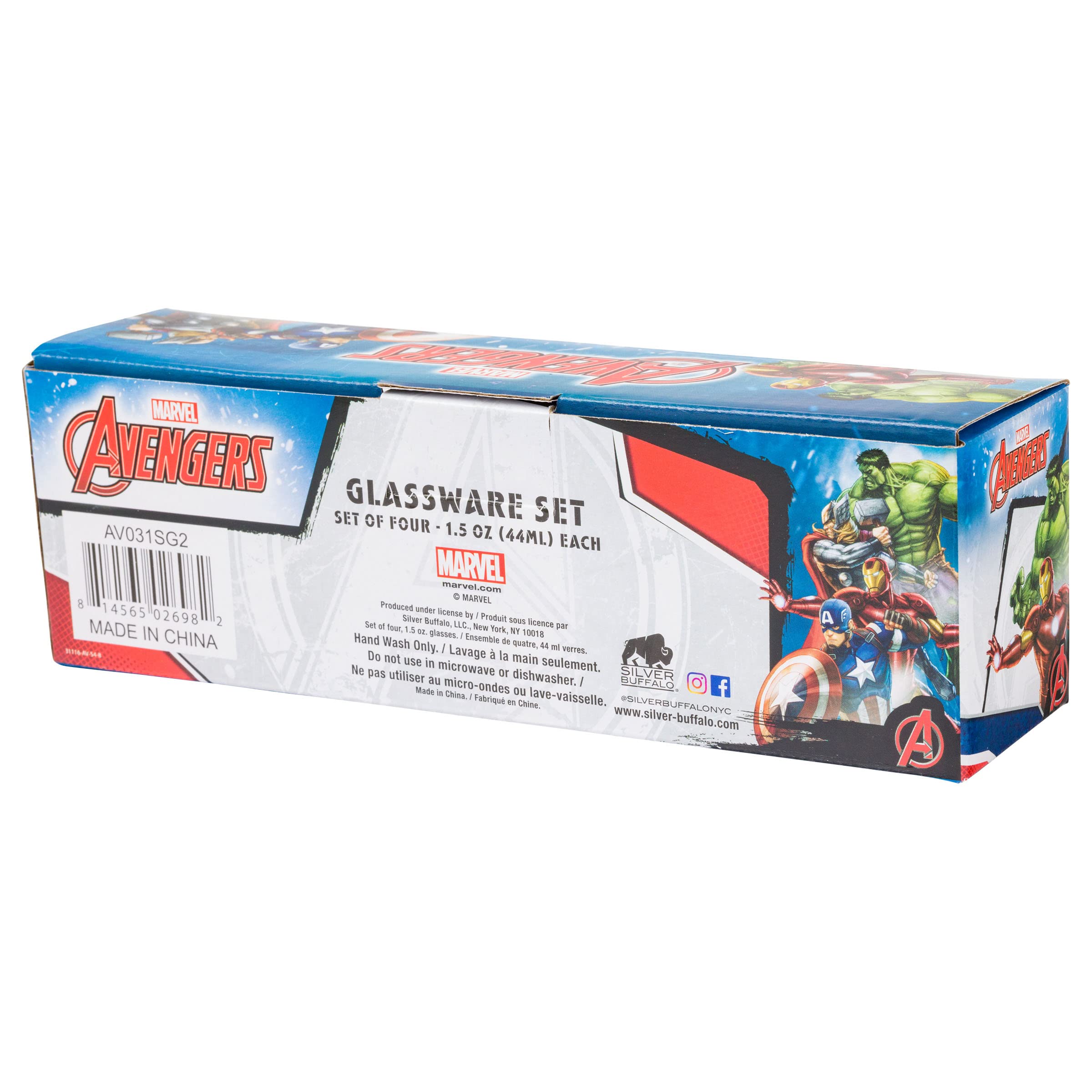 Have fun with your friends and loved ones with this classic Marvel 4-Pack 1.5 oz Mini Glass Set thanks to the Silver Buffalo Marvel Avengers Splatter Background 4pc Clear Mini Glass Set. This 4-pack of mini-glasses holds 1.5 oz of each of your favorite drinks. Make your party cool with this awesome Avengers 4pc. Mini Glass set of your favorite iconic Avenger characters with a Splatter Background. Mini-glasses are top-rack dishwasher-safe but are not microwave-safe; avoid using cleaners with bleach or chlorine within them. Have confidence knowing you are purchasing an officially licensed Marvel product from Silver Buffalo. This mini-glass set makes a great gift for all the Marvel fans in your life; whether it’s for girls, boys, kids, or adults. Great for any occasion whether it is Christmas, Birthday, or Housewarming gift. Working in collaboration with licensors and brands, Silver Buffalo develops unique, creative, and ground-breaking products with a devotion to detail and innovation, while staying true to current trends. Silver Buffalo prides themselves on manufacturing and distributing exciting products that connect with the child or fan(atic) in all of us. We focus on the design, manufacture, and distribution of items featuring popular cultural icons. Silver Buffalo features all of your favorite comic heroes, cartoon characters, board games, movies, and more. #TAG: Housewarming, Gifting, Party decorations, Collectable, Party decor, Celebration, Espresso, Drink-ware, 4-Pack, Glass set, Single Sip, Christmas, Glass, Glass cups, Mini Glass Set, Mini Glasses, 4 pc. glass set, 1.5oz glass set, Marvel, Avengers, DC Comics, Iron Man, Captain America, Hulk, Thor, Super Hero