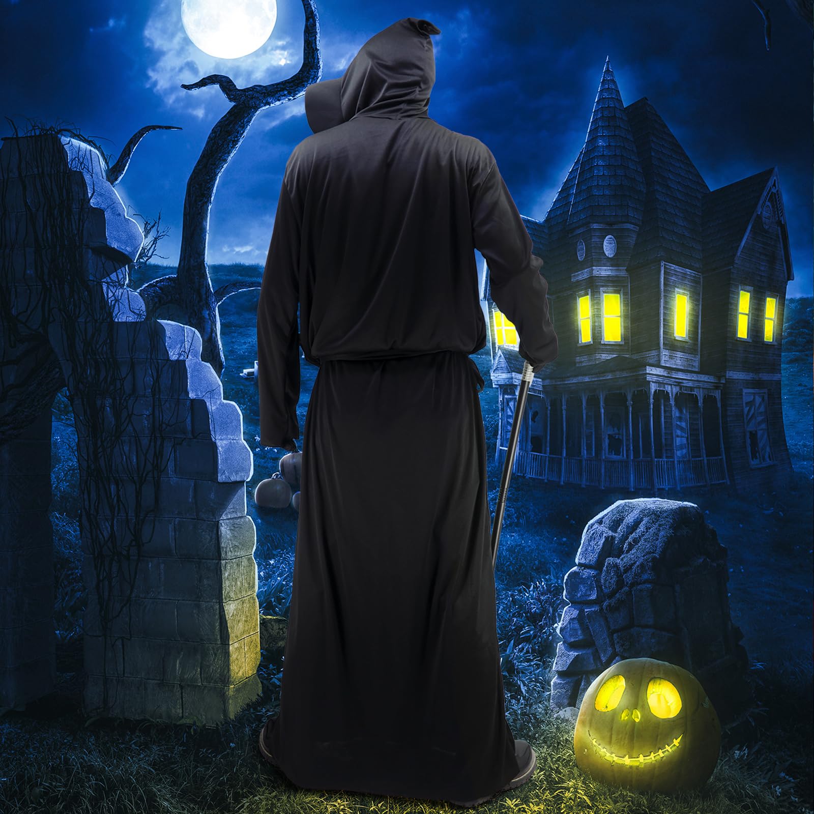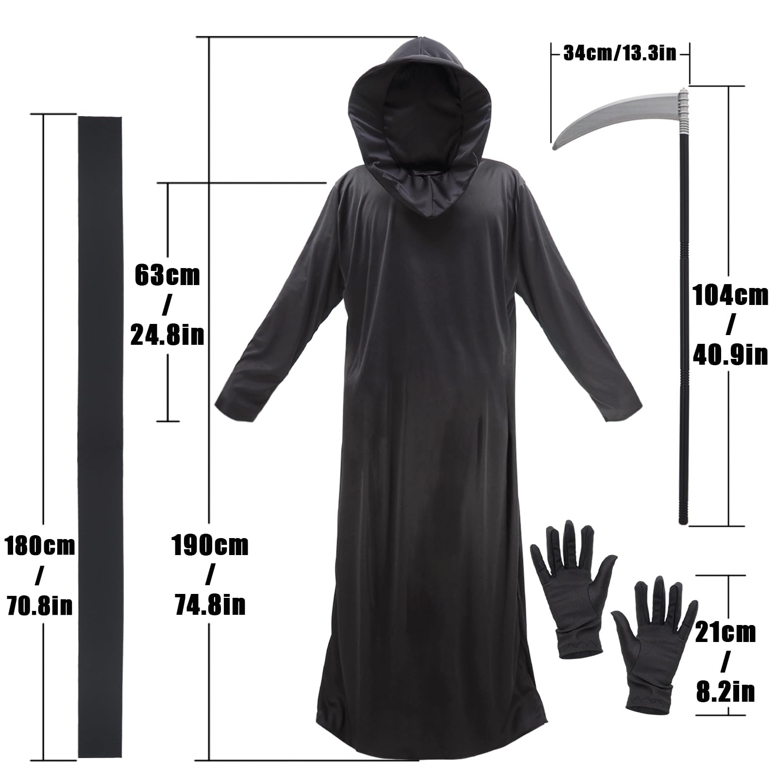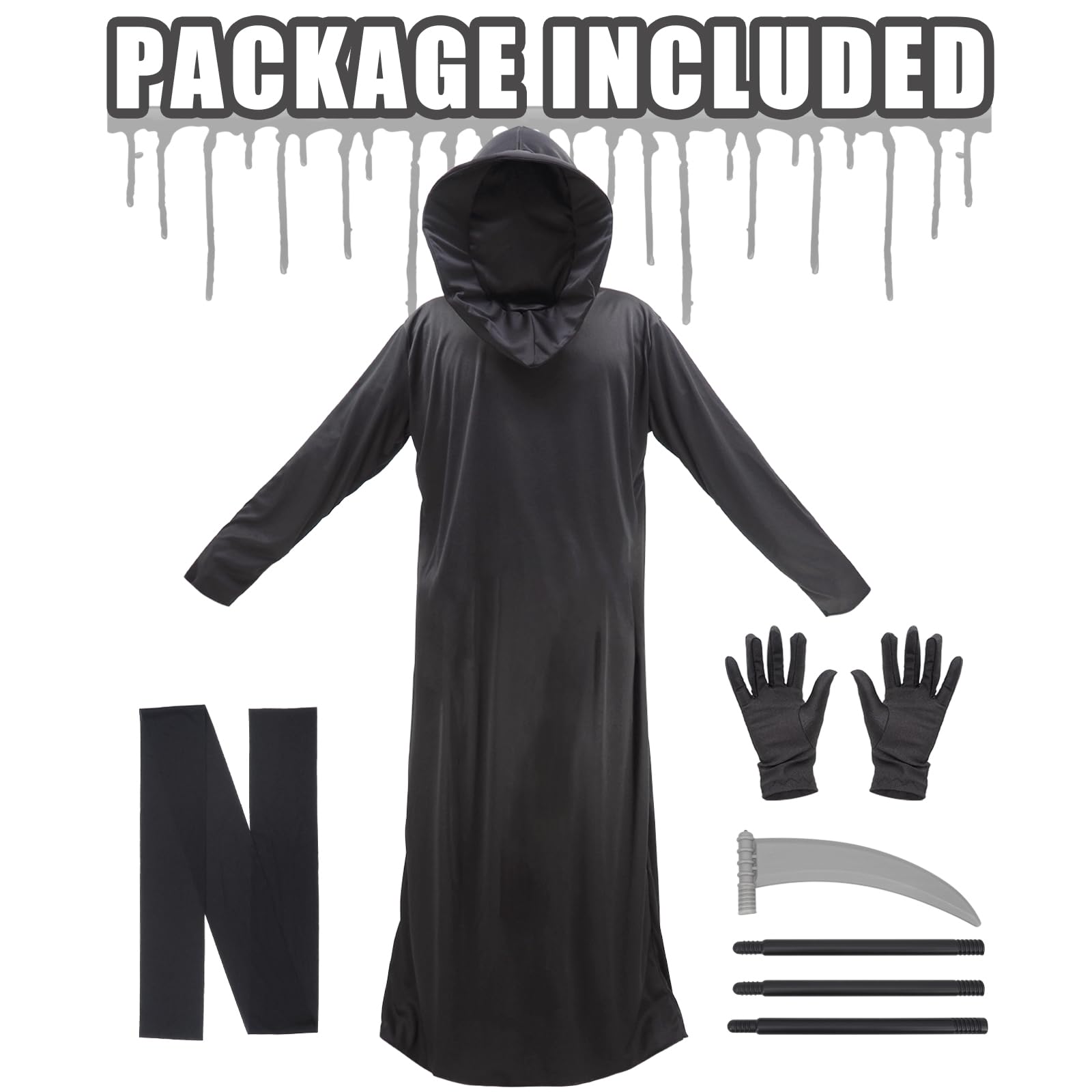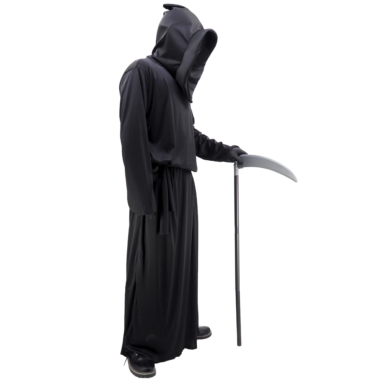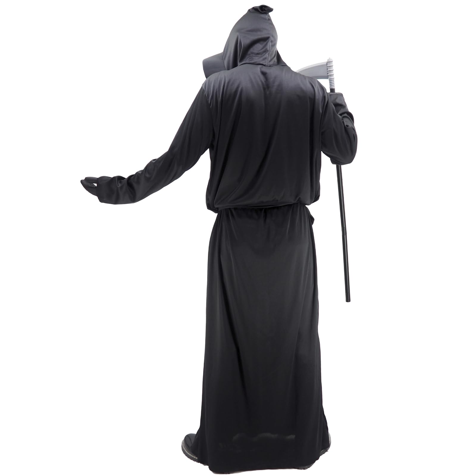 Complete Grim Reaper Set: The package includes a long black robe with a mask hood, gloves, and a detailed scythe prop for a full transformation.