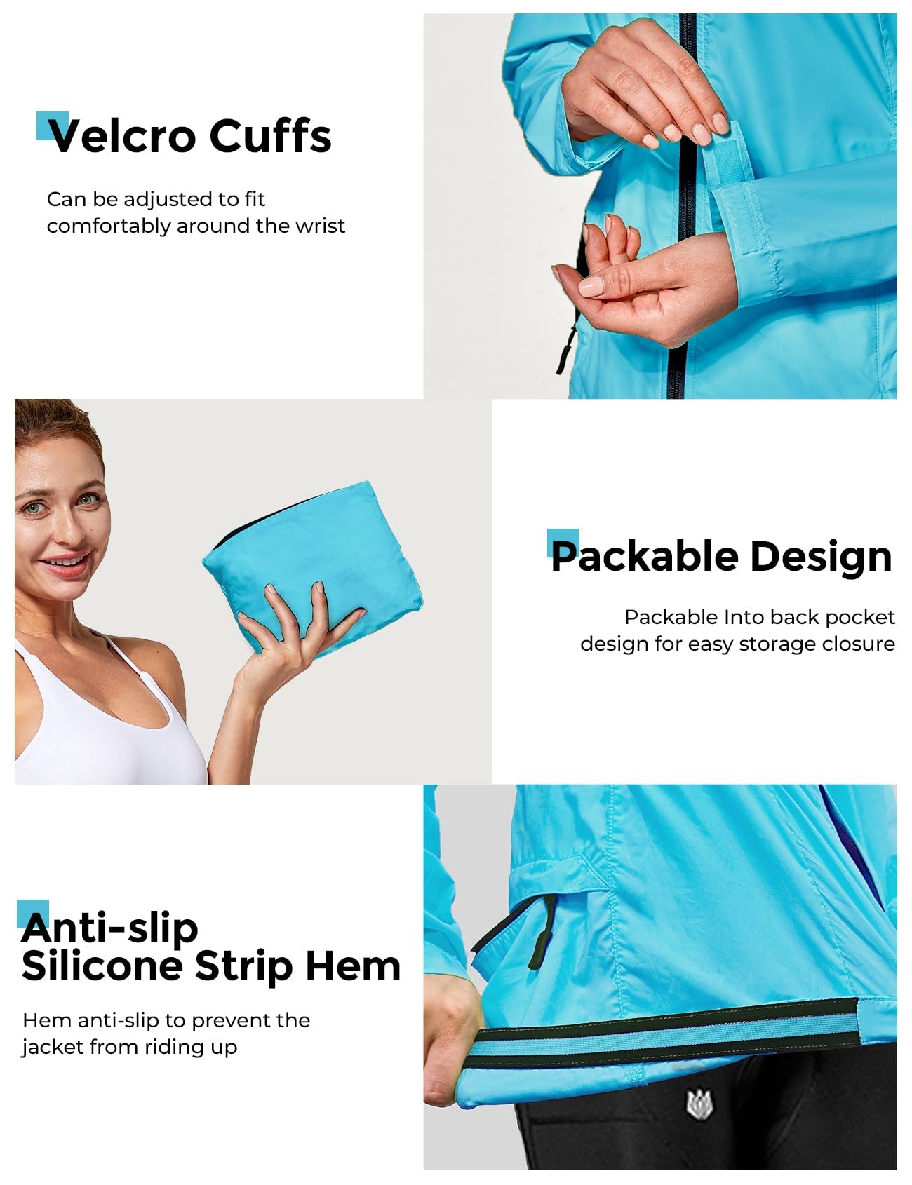 【Practical Designs】Hem anti-skid prevent jacket rides up; Packable Into back pocket design for easy storage closure and the wrist elastic band had a velcro adjustment on it to have the option of having to wear it loose or tight;Adjustable drawstring on waist to adjust the style of this running jackets which could naturally brings out your feminine curves