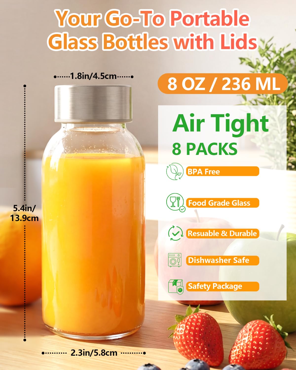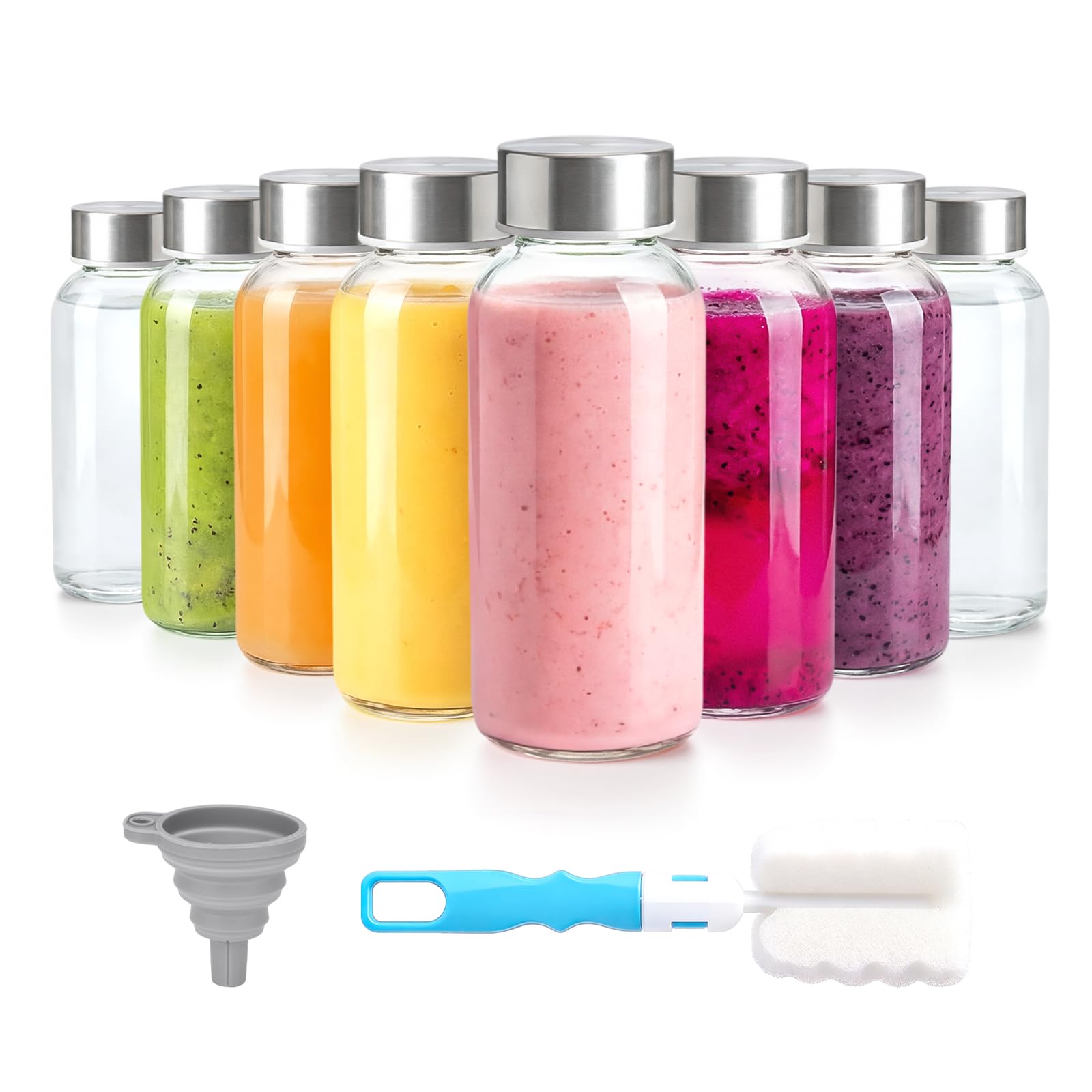 SAVE MONEY WITH THIS VALUE PACK: Juicing Kit Bundle includes : 8 pack clear 8 oz glass milk bottles with airtight lids, a bottle cleaning brush for easy hand washing, a funnel helps you pour liquids inside the glass juice containers. Get our juicing jars in bulk packs as gift for your whole family and friends.