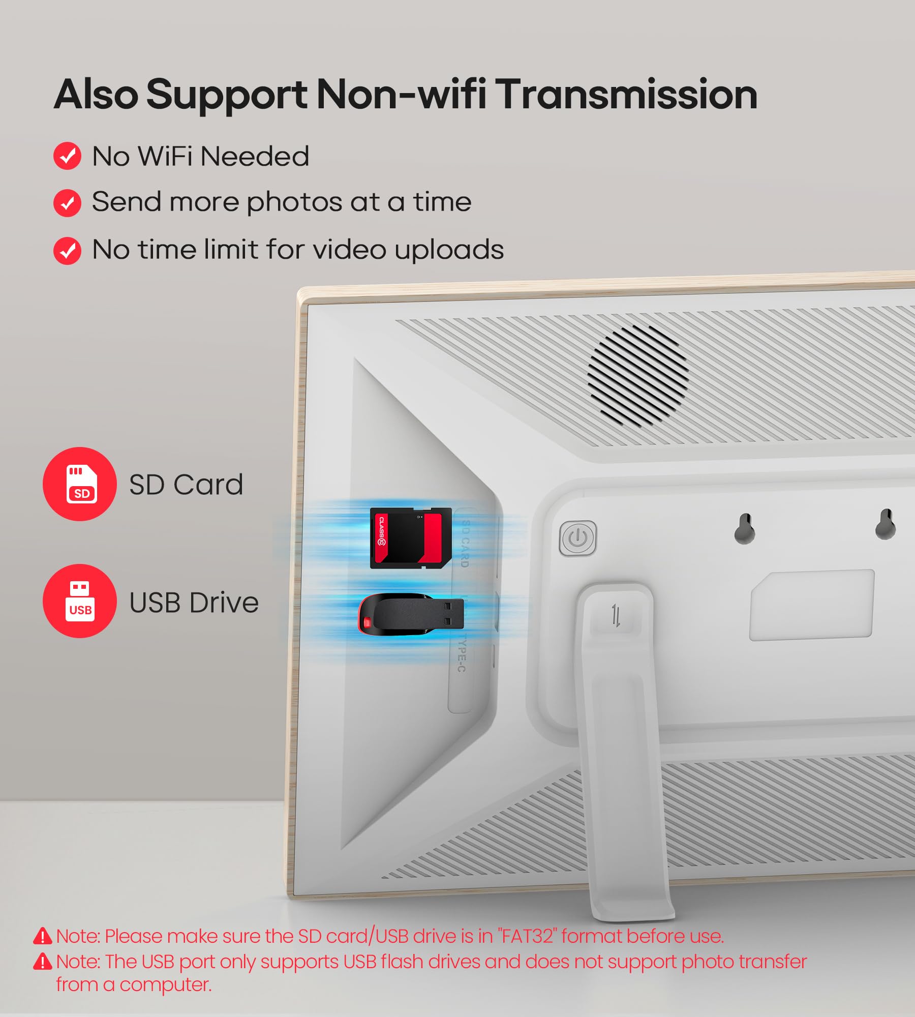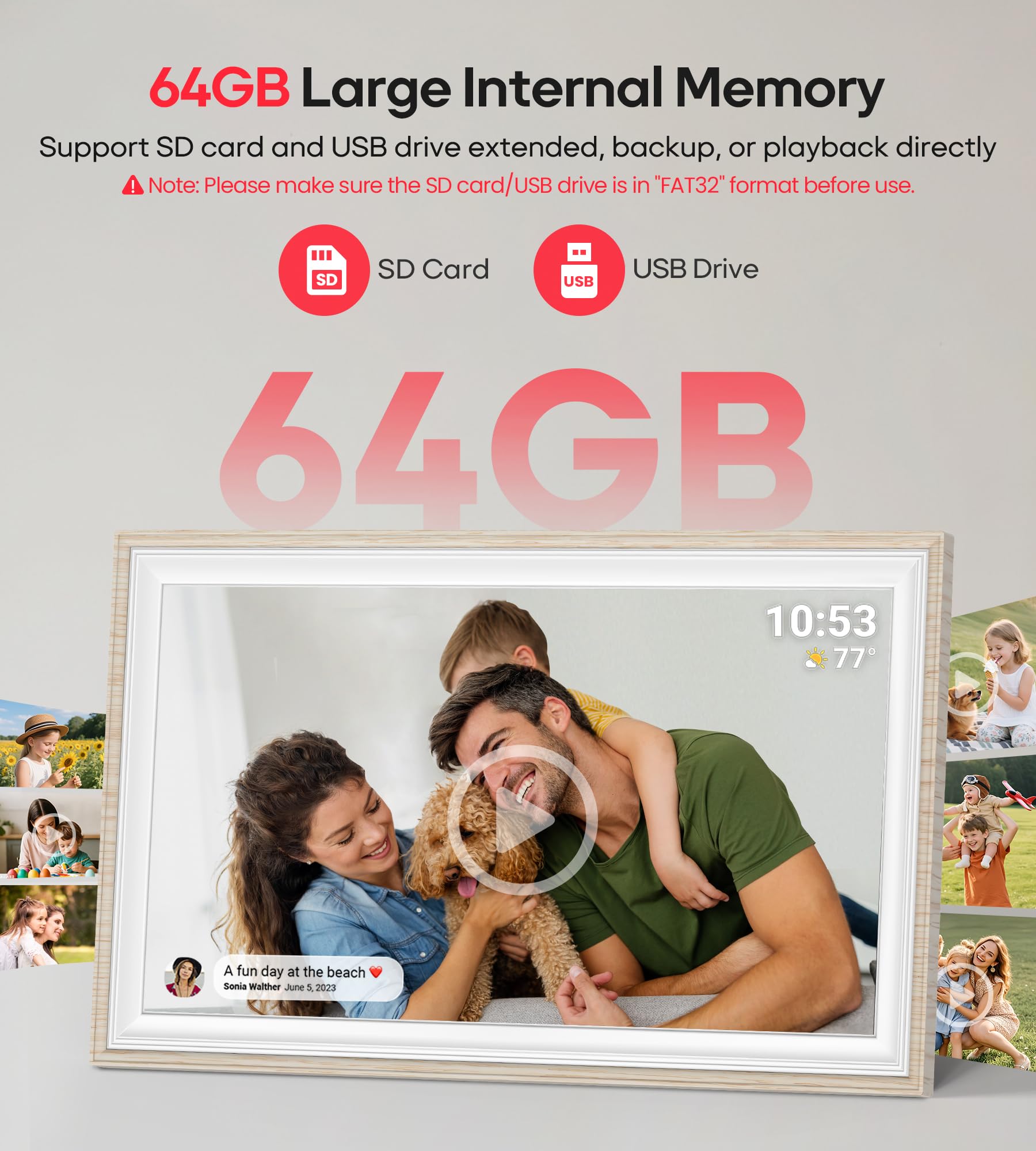 【64GB Large Memory & Supports SD Card/USB Flash Drive】Built-in 64GB large storage space (can store about 100,000 photos). Supports direct playback of photos and videos on SD card and USB flash drive without importing, and can also expand storage, import, export, and backup pictures through SD card or USB flash drive. Note: 1. Please make sure the SD card/USB drive is in "FAT32" format before use. 2. For better compatibility, we recommend using a 32GB SD card/USB drive, as 64GB and 128GB options may not work properly with the frame. 3. The USB port only supports USB flash drives and does not support photos transfer from a computer