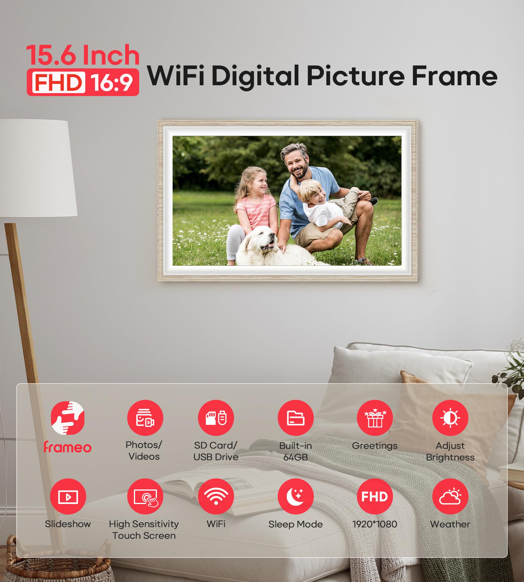 【Share Photos and Videos Instantly Via "Frameo" APP】Share every wonderful moment with your family and friends. Connect the 15.6" digital picture frame to a WiFi network and share photos and videos anytime and anywhere Via "Frameo" APP. Photos and videos can be presented within a few seconds, add titles to photos to show your mood and experience fully! Download the "frameo" app for iOS and Android for fr-ee to give you full control of the large digital frame