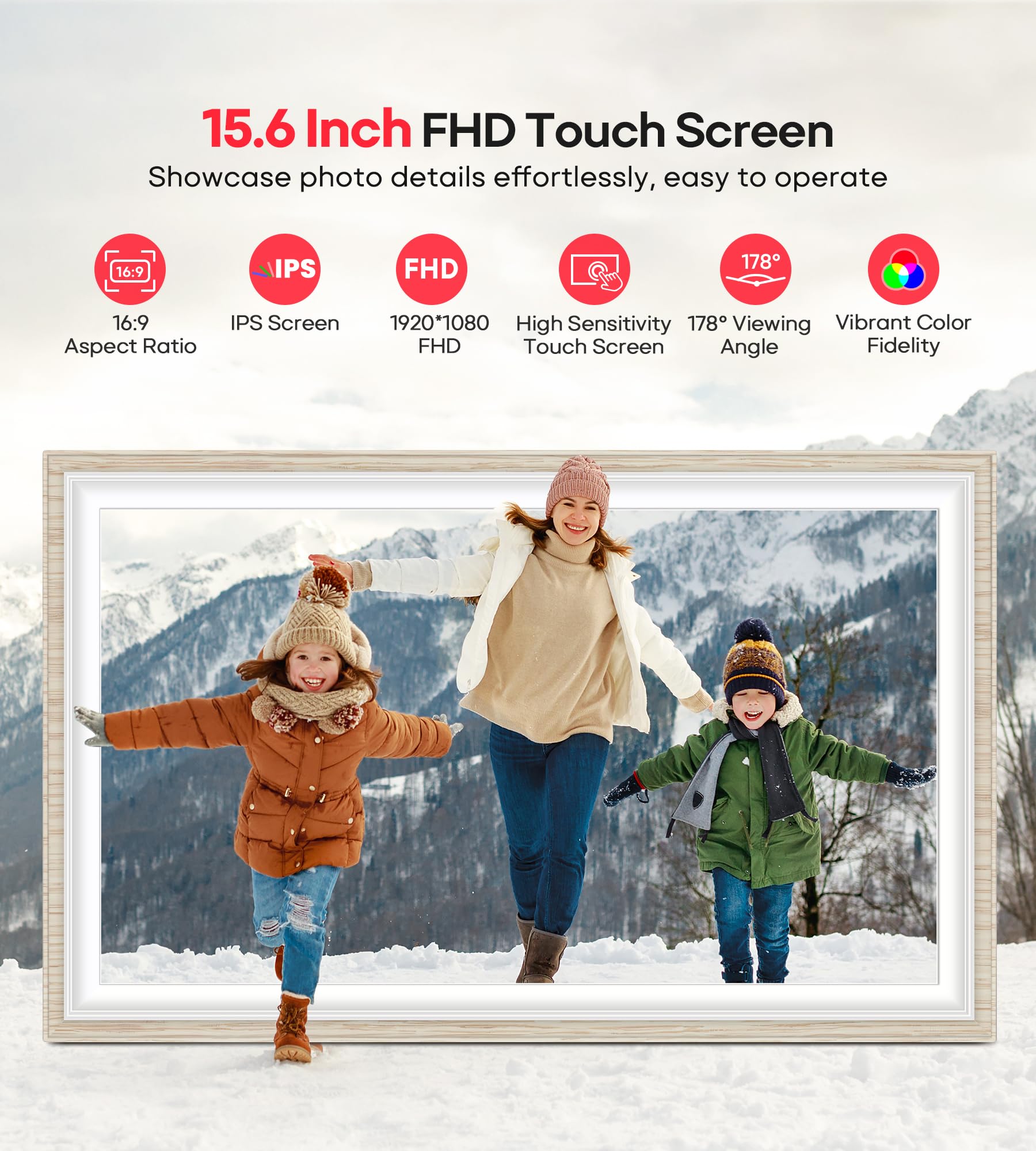 【15.6 Inch Large IPS FHD Touch Screen】The 15.6-inch large wifi digital frame is equipped with a full-view display screen with 1920x1080 pixels for vivid colors and exquisite details. The touch screen design to easily set up and view photos. Through the 15.6" smart photo frame, you can see the tiny ripples in the lake, capture the slightly raised smile at the corner of the eye, and perceive every tiny detail, which together constitute your colorful life. Supports picture formats JPG/JPEG/BMP/PNG and video format MP4. Product Dimensions: approx. 15.43 x 9.61 inch