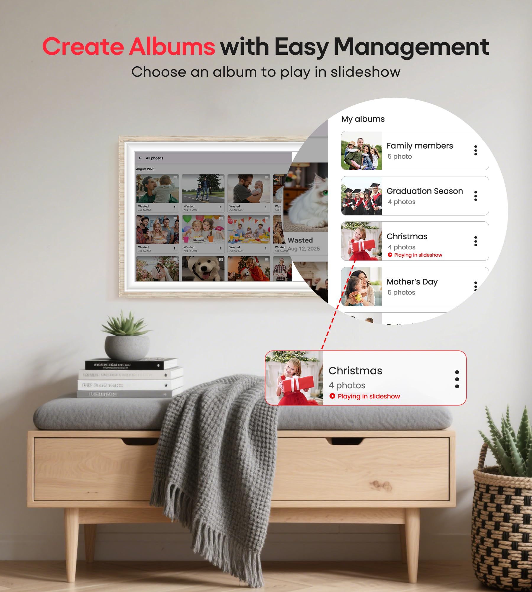 【More Impressive Special Features】① Create Albums: Album management keeps your photos organized and makes memories easier to find and enjoy. ② Fun function: Use "React" to send emojis to loved ones in real time to let the sender know how it made you feel. ③ Greetings: Never miss out great moments by sending greetings anytime. ④ Auto Rotation: Automatically rotates photos horizontally or vertically. Equipped with a detachable stand and a screw, you can place the digital frame on the desk or hang it on the wall. ⑤ Custom functions: play order, adjust brightness, title display, sleep mode, etc