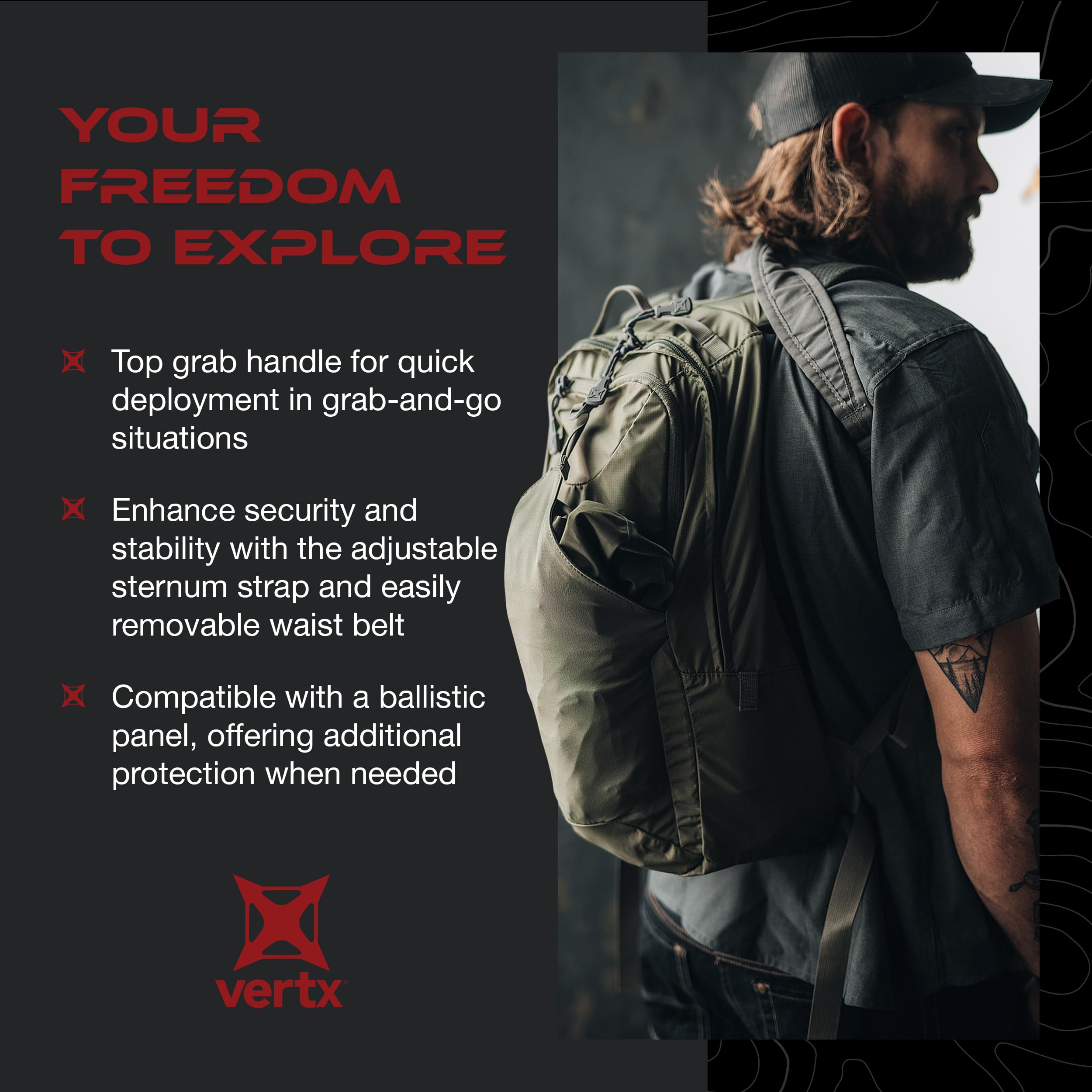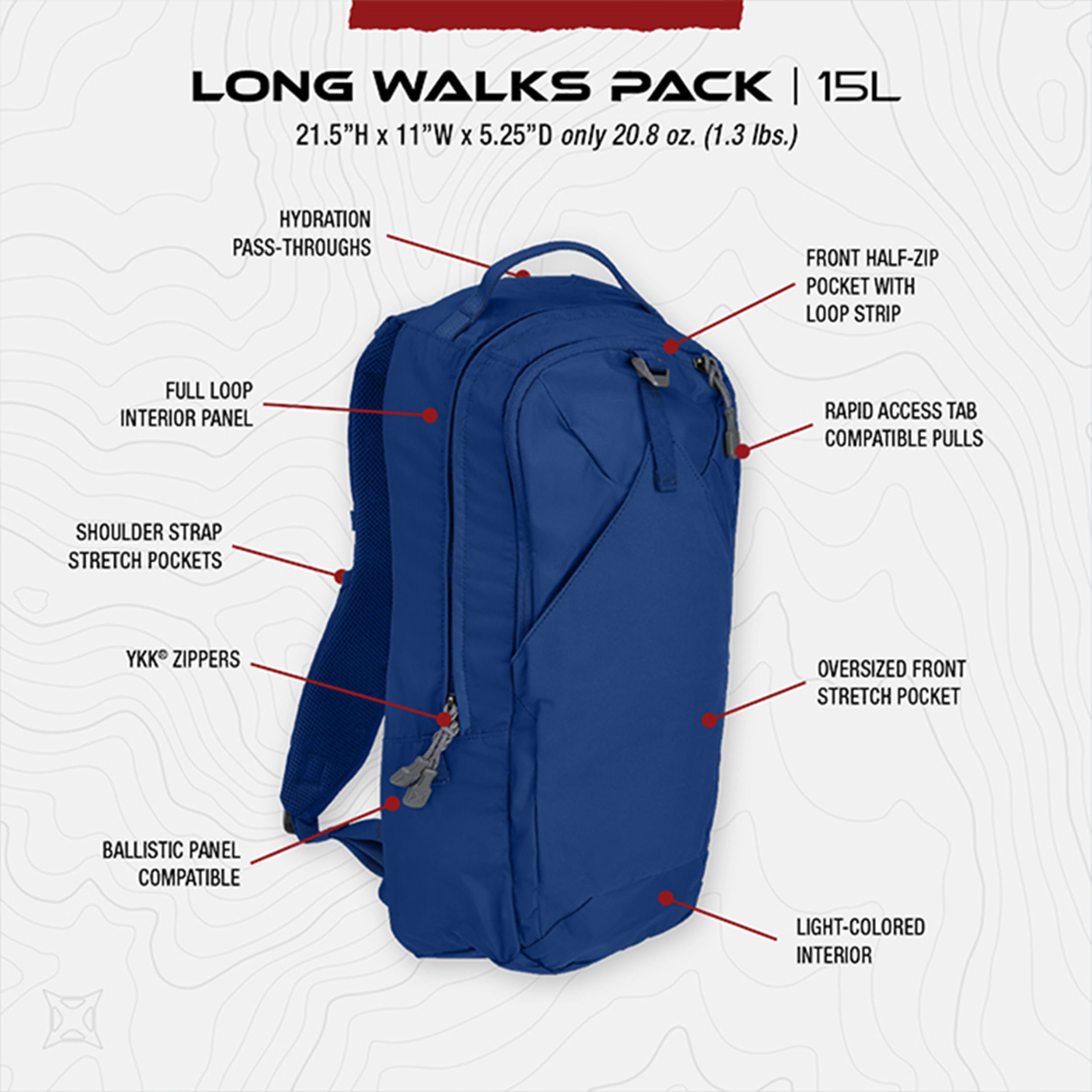 SMART ORGANIZATION – This EDC tactical bag is compatible with a ballistic panel for added protection. The spacious main compartment and the front pocket with top-level adjustability offer flexible customization. Outside Dimensions: 21.5"H x 11"W x 5.25"D.