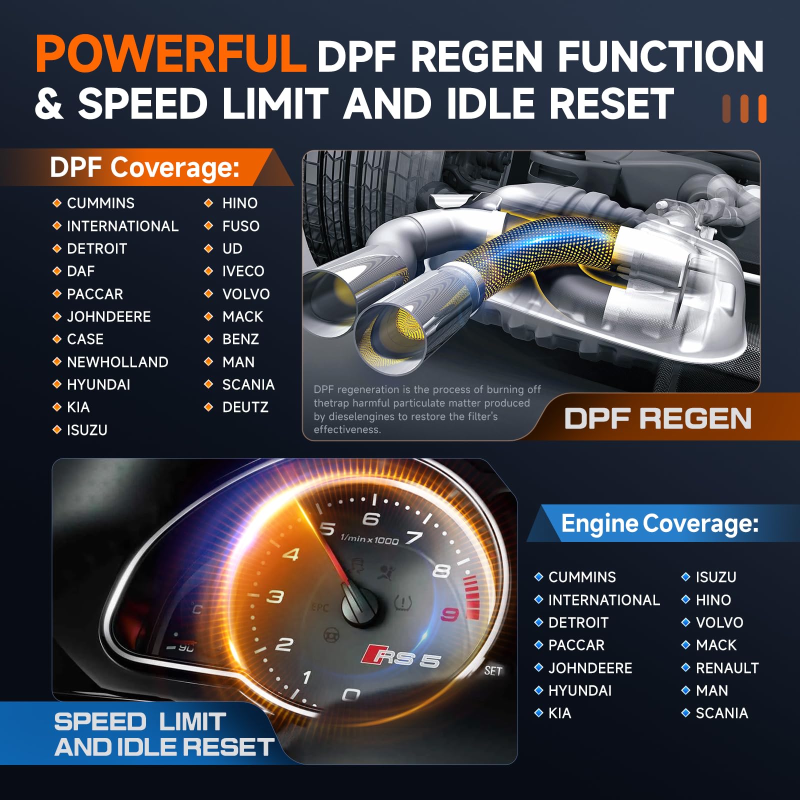 🚛OEM DPF Forced Regen & Cylinder Cutout Test & more - ANCEL X7HD diesel scanner diagnostic tool not only supports DPF regeneration, DPF reset, DPF related information reset, DPR state reset, DPD forced regeneration etc, which helps you better solve the exhaust aftertreatment system problems, but also supports activate motor to do exhaust air in ABS Automatically. Moreover, it features TPMS activation, cylinder cut-off and learning functions