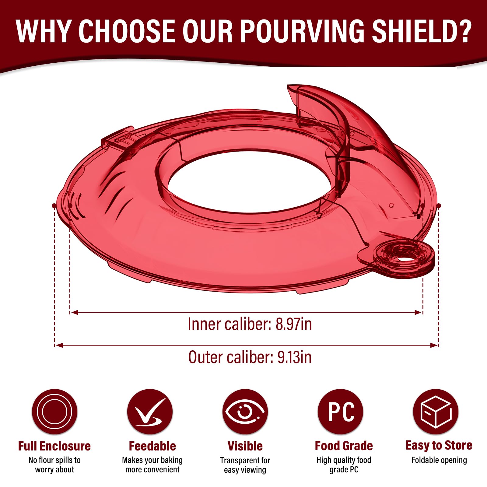 【Large angled pour chute】- Our kitchen aid accessories and attachments - pouring shield for kitchen aid 4.5-5 quart features a large angled ingredient slide, helping you easily add ingredients to the kitchen aid stainless steel mixing bowl without wasting your raw materials.