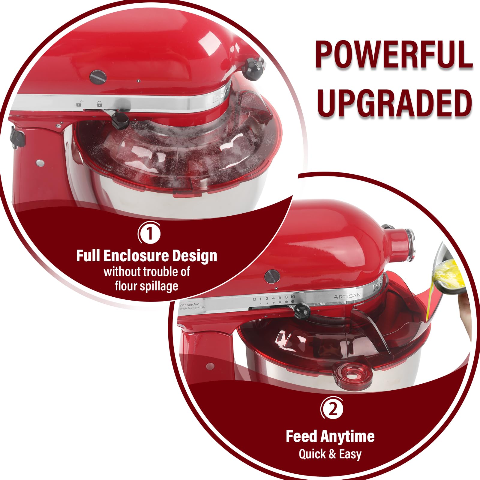 【Upgraded Design】The full wrap-around pouring shield and standard splatter shield chute dust cover perfectly retains the ingredients in the center for kitchenaid mixer bowl, and the mixing will be more efficient and thorough, effectively preventing splashes and spills when mixing lightweight ingredients such as flour. Upgraded dump hood with quick lock ,quickty installs ,removes reduce mess and save your time.