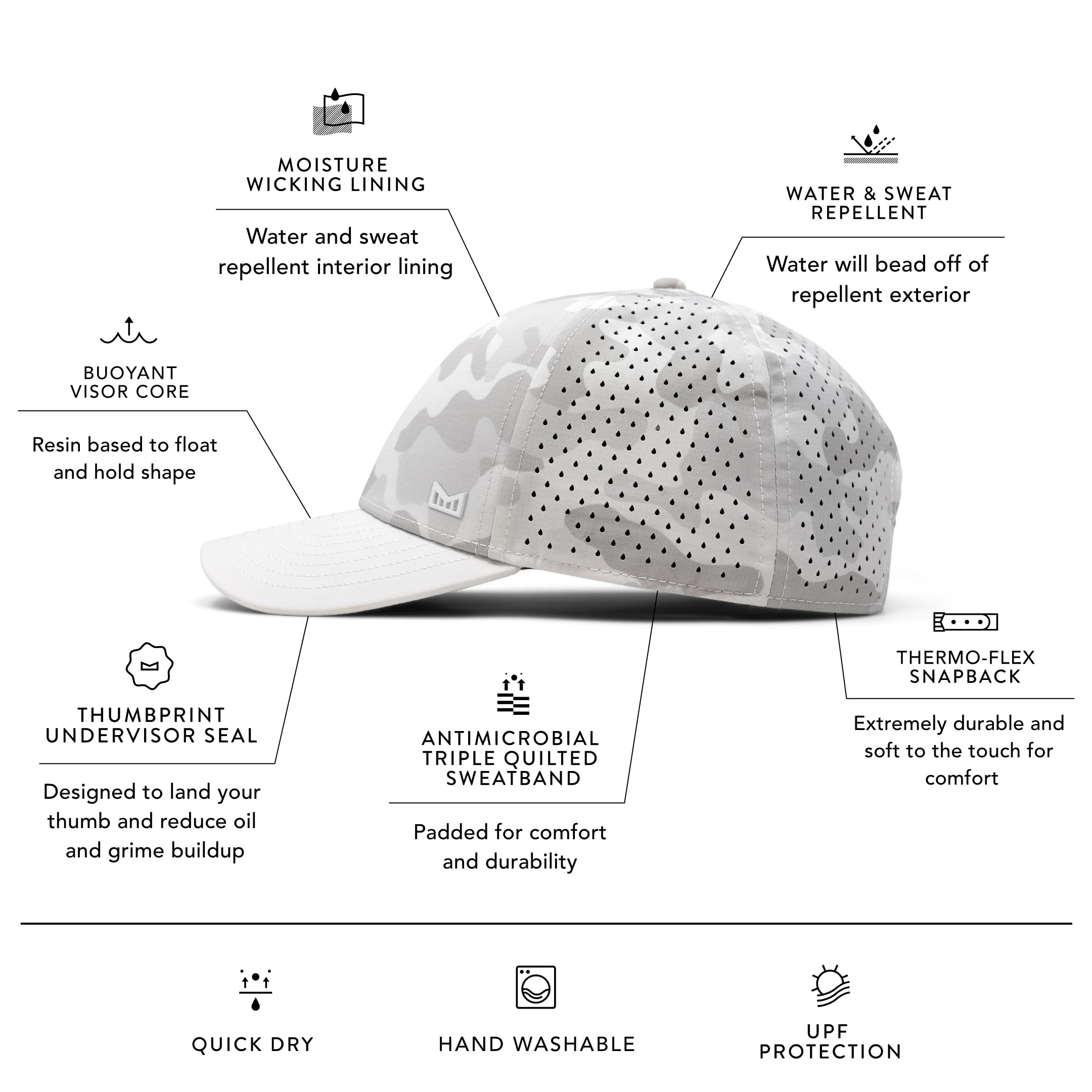 PERFORMANCE SNAPBACK HAT: Exterior crown has hydrophobic crown panels, laser-perforated side & rear panels for breathability, and adjustable snapback closure. Visor has hydrophobic exterior, water capable core, and signature under visor seal