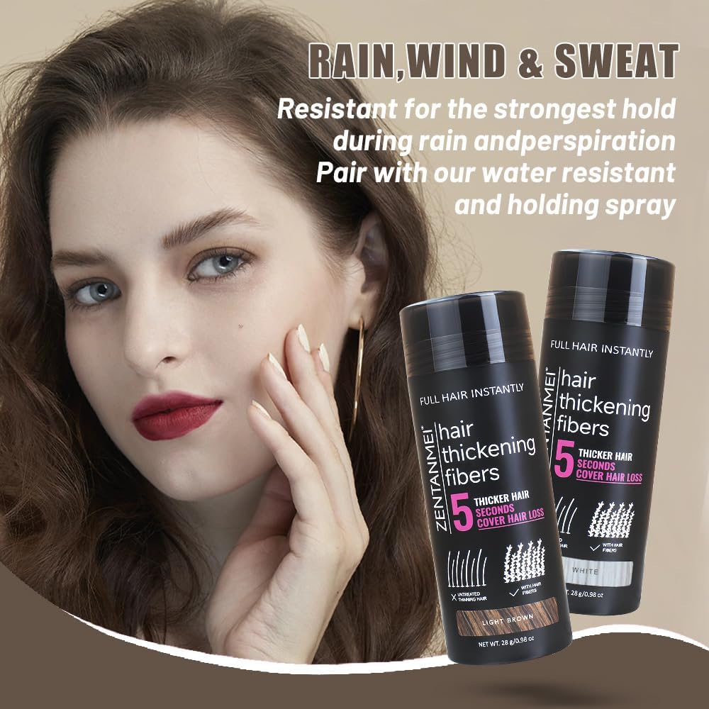 Hair Growth Fiber Weatherproof:Weatherproof and long-lasting all day long, Hair Growth Fiber Powder contains microfibers with static electricity that seamlessly attach to your hair without causing skin irritation and resisting sweat, wind and rain