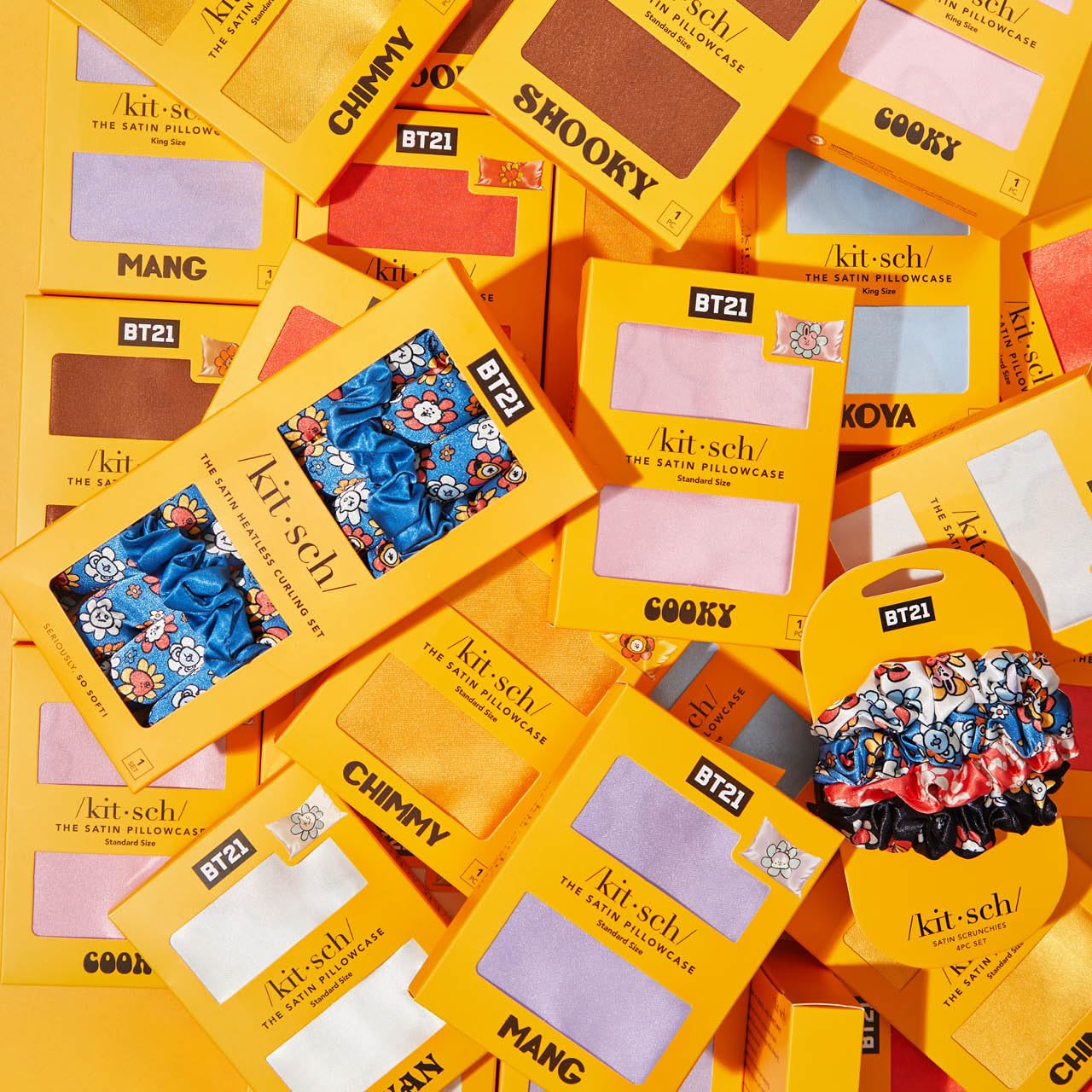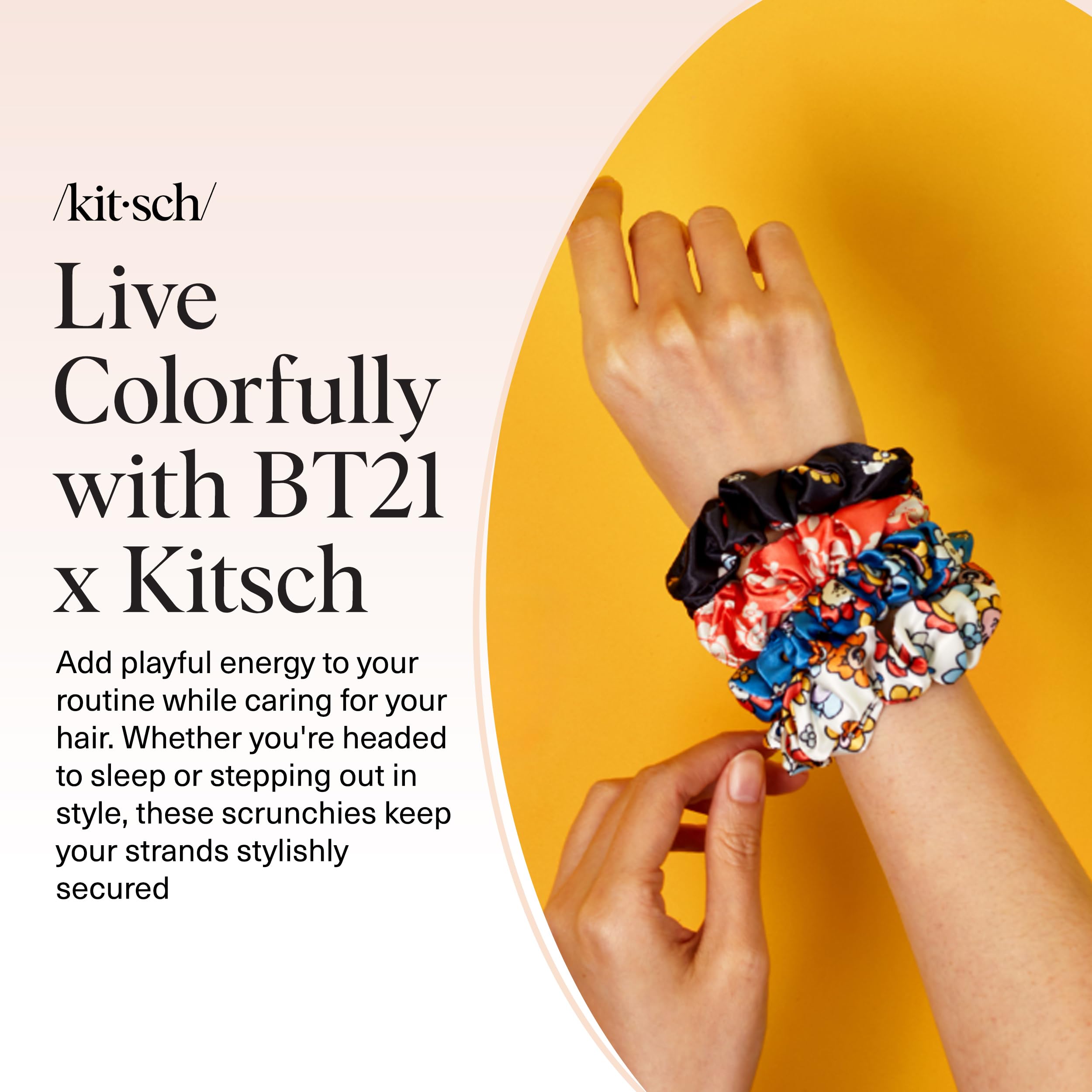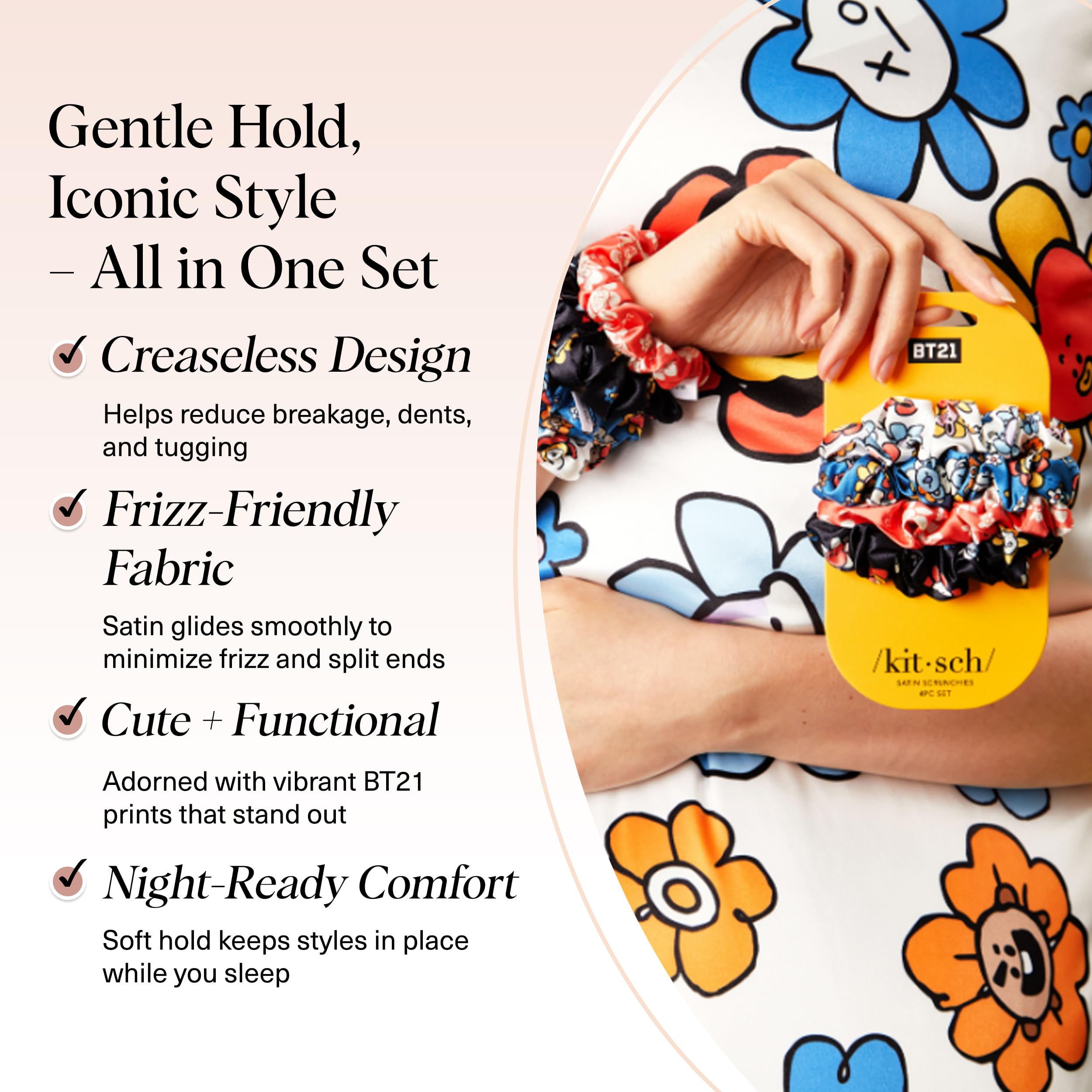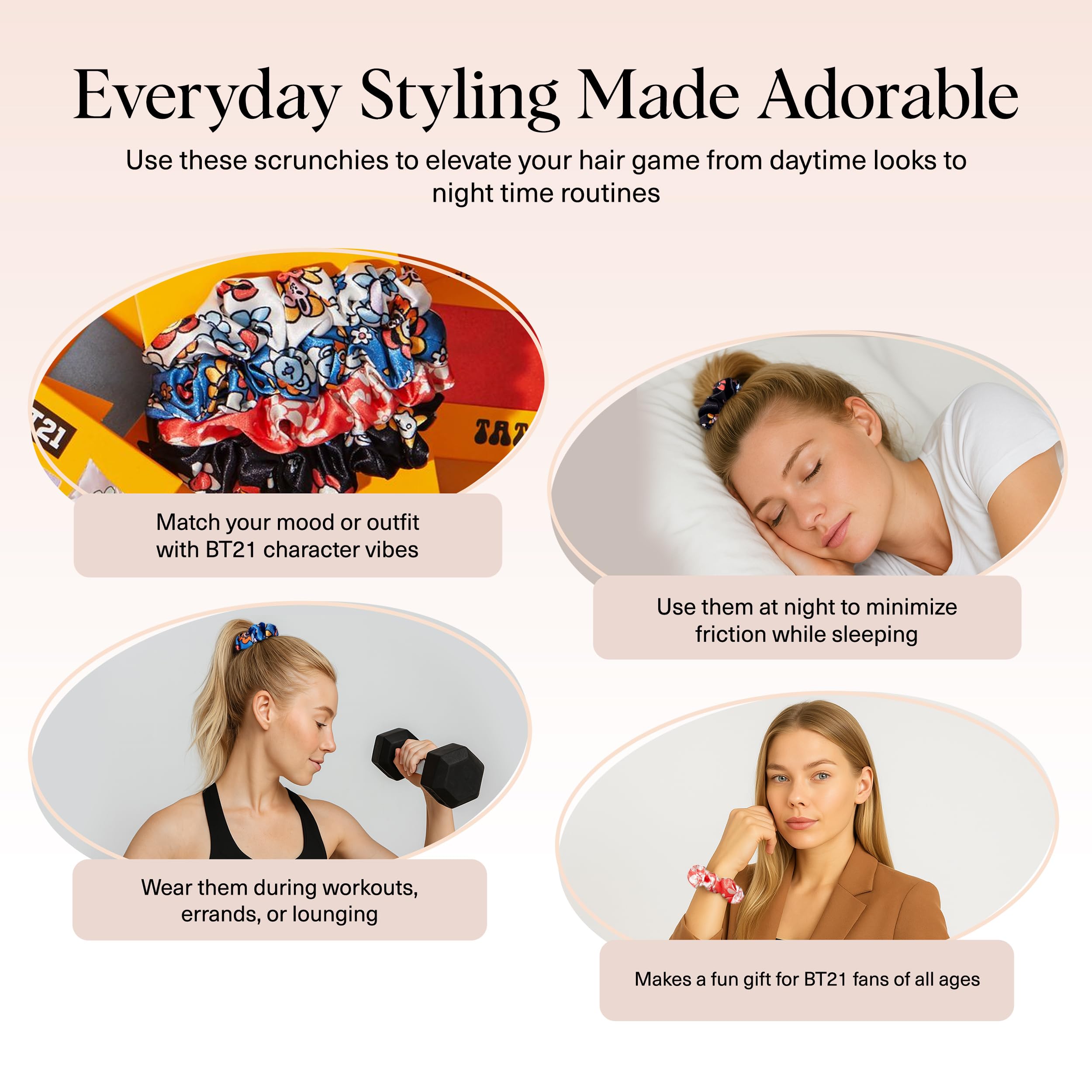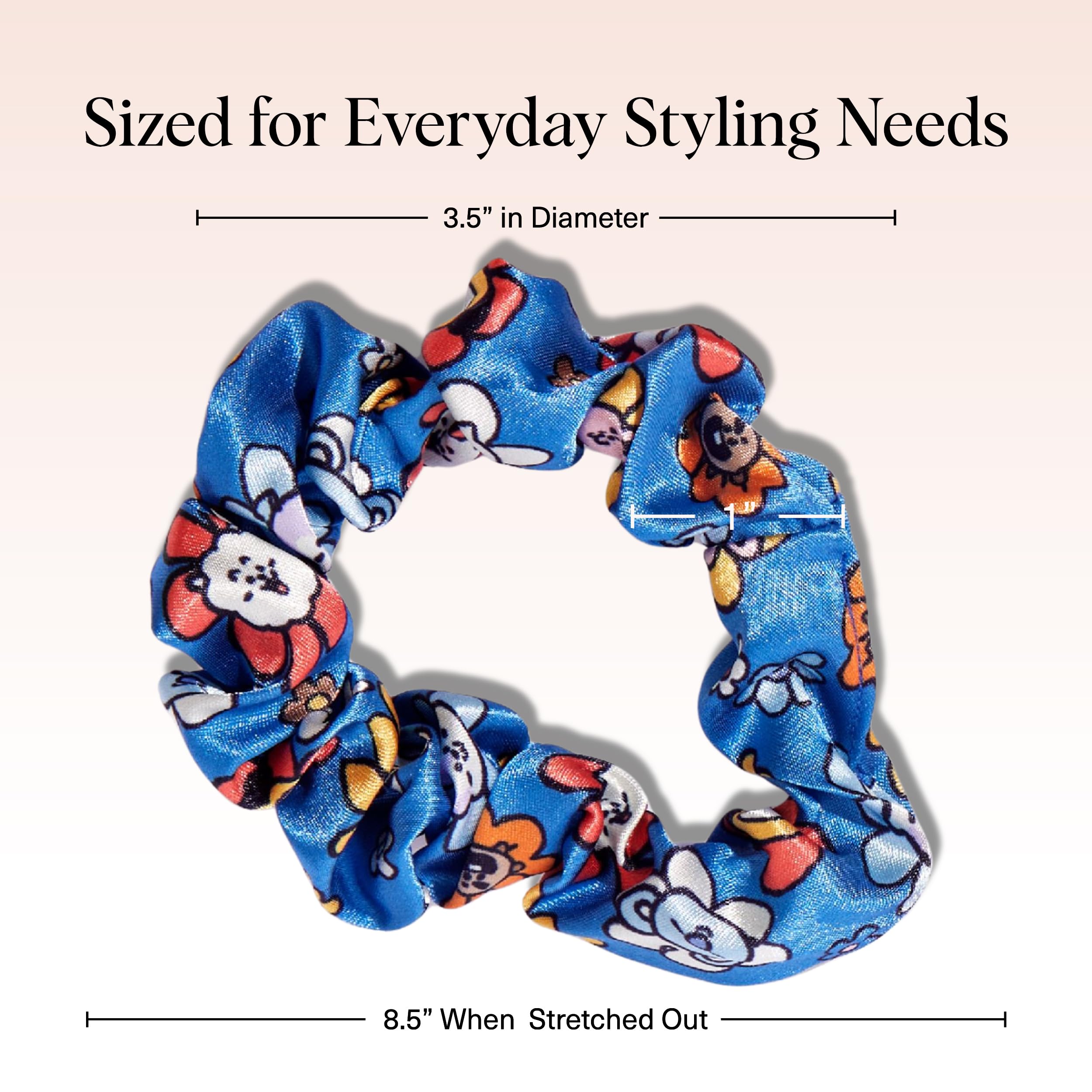SET OF FOUR SATIN SLEEP SCRUNCHIES: Upgrade your style with our set of four hair scrunchies for women's hair! Embrace funky floral prints with our cute scrunchies for thick hair, each adorned with your cherished BT21 characters, and elevate your bedtime routine with this charming collection!