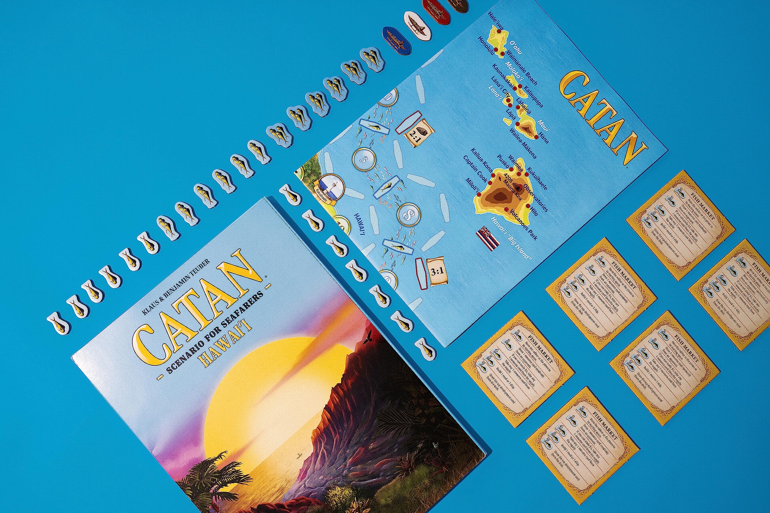 TROPICAL ADVENTURE: Set sail for a Hawaiian fishing excursion. Immerse yourself in the beauty of the Pacific archipelago as you enjoy all the excitement of the beloved CATAN expansion in a tropical paradise.