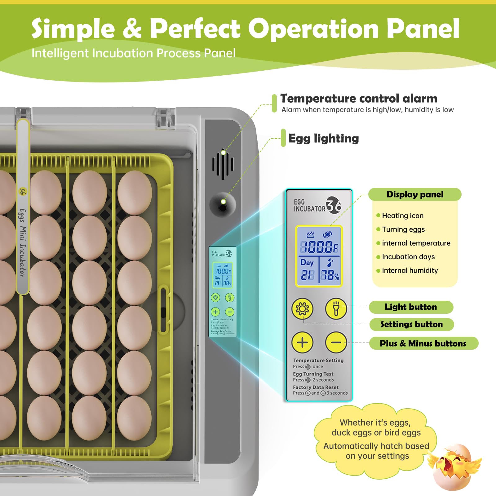š¤š¤ćMultifunctional & Easy to Operateć-- The multifunctional egg incubators for hatching eggs can hold 36 eggs, is simple and user-friendly to set up, and has internal protective walls that provide a safe environment for chicks. Our incubators are easy to install and remove, simple to use and easy to clean, dramatically enhance your incubation experience with our high-quality incubators.