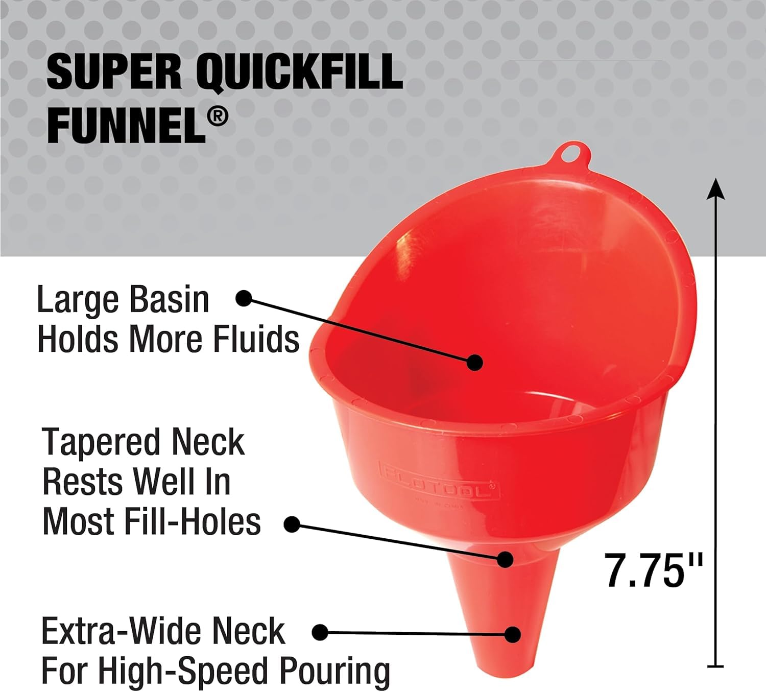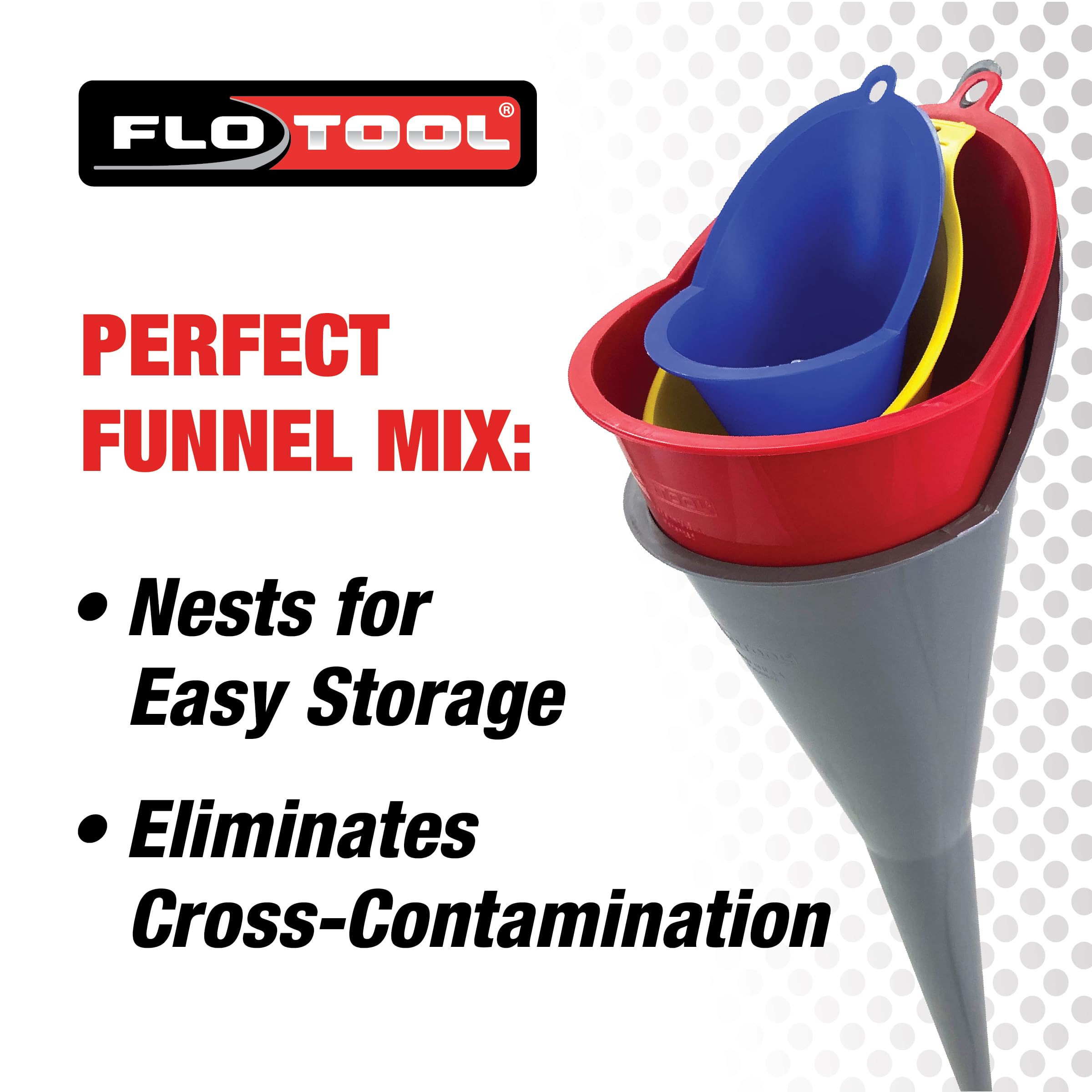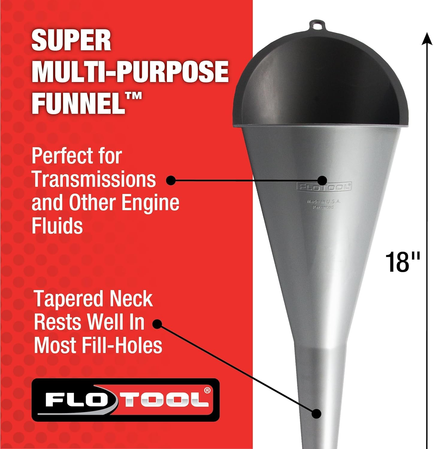 FloTool, by Hopkins Manufacturing, offers the most comprehensive and highest quality offering of fluid handling products. Driven by innovative, no-mess product solutions, whether you're changing your oil, topping off the antifreeze or checking all your automotive fluid levels, FloTool has the right application. FloTool' s Super Multi-Purpose Funnel is perfect for transmissions, oil, and other engine fluids. FloTool introduces this new 4-piece funnel set that will make all of your fluid application processes a breeze. These three very different funnels will ensure that you have the tool to get the job done right. Comes with a 90-day FloTool warranty with proof of purchase.