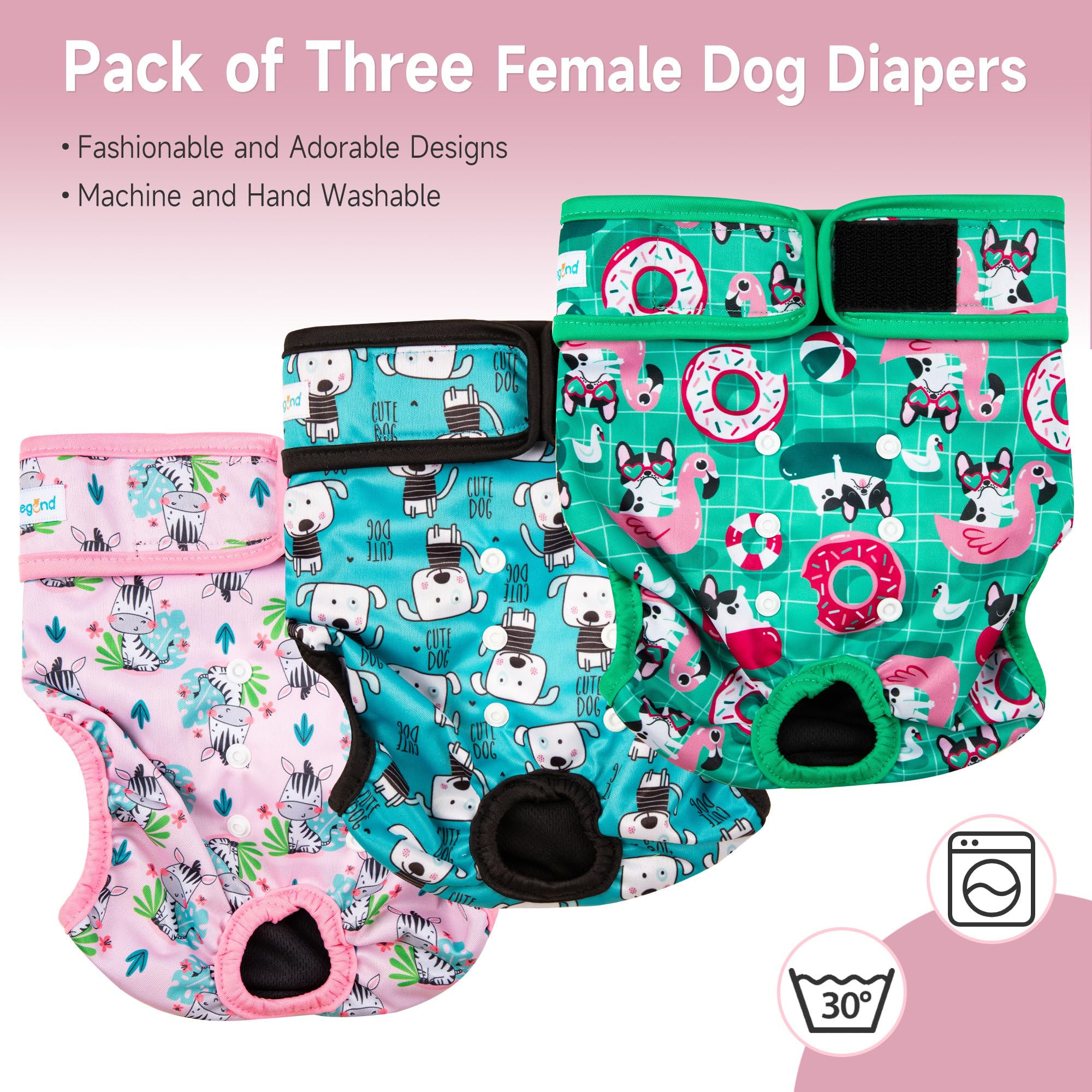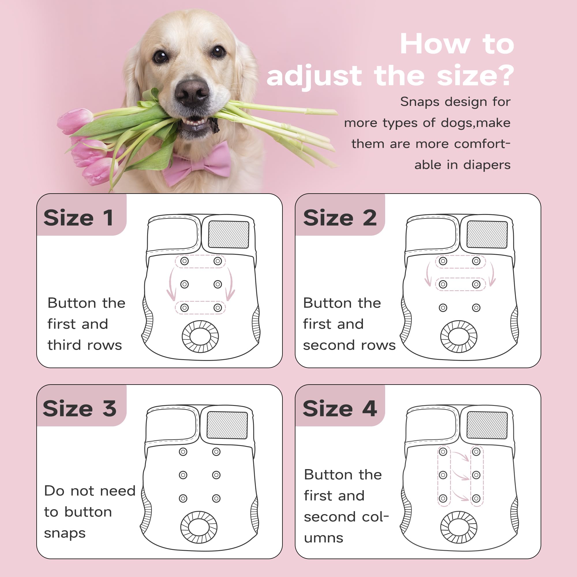 Pack of 3: Paw Legend Dog Diapers Female are available in 5 sizes ranging from XS to XL. Carefully measure your dog's waist and back legs, and refer to the size chart for the perfect fit.
