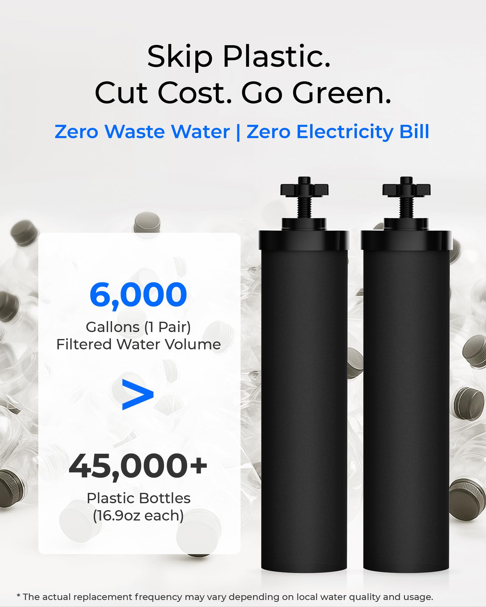 Skip Plastic, Go Green: Make a sustainable choice with the gravity water filter that helps you skip plastic bottles and reduce costs. Each pair filters up to 6,000 gallons of water, saving over 45,000 plastic bottles (16.9oz each) while providing zero-waste, zero-electricity drinking water.