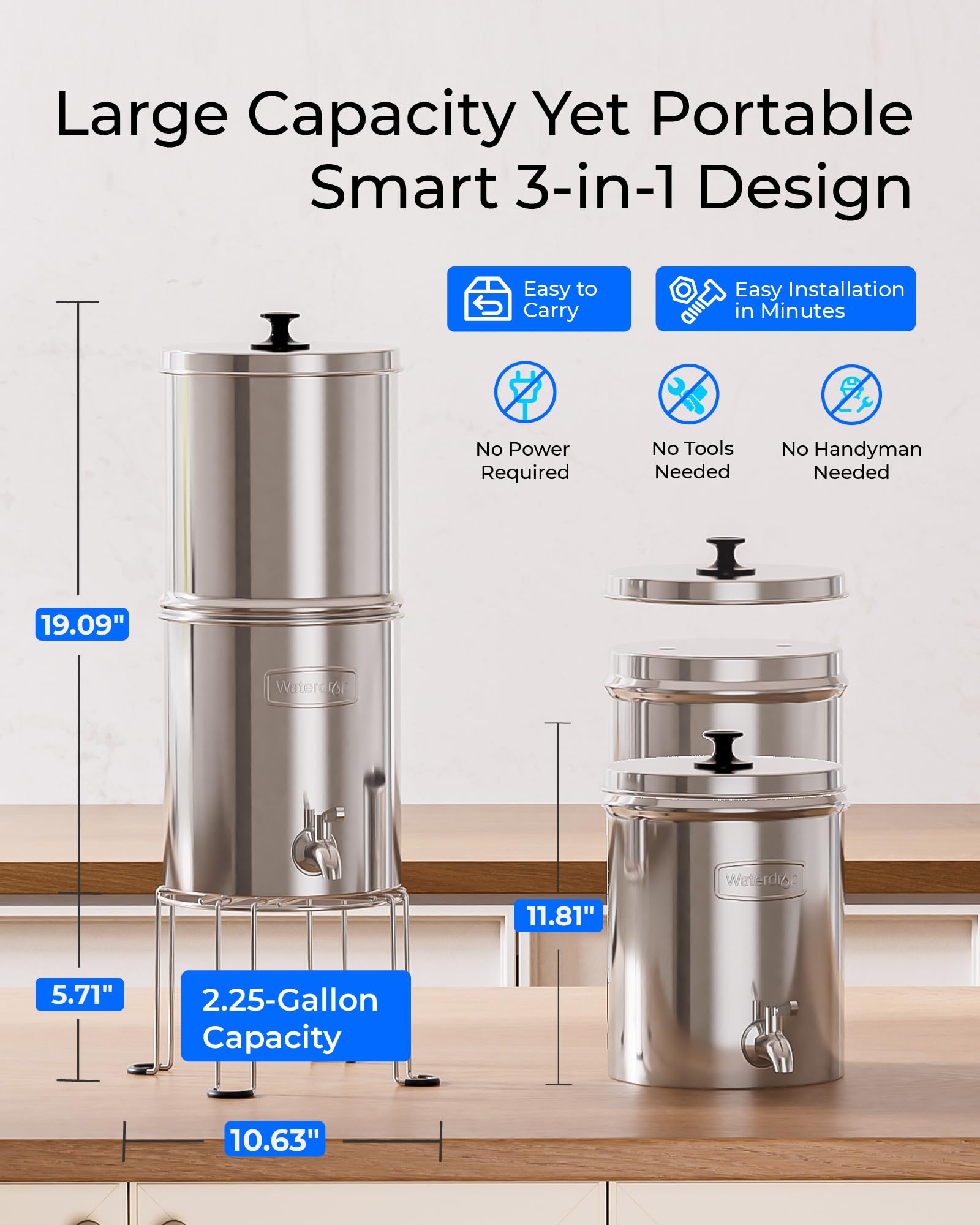 Large Capacity & Smart Design: This gravity water filter offers a large 2.25-gallon capacity in a compact, portable design, making it easy to carry and perfect for everyday use. With its smart 3-in-1 design, installation is a breezeāno power, tools, or handyman required, and it's ready to use in minutes.